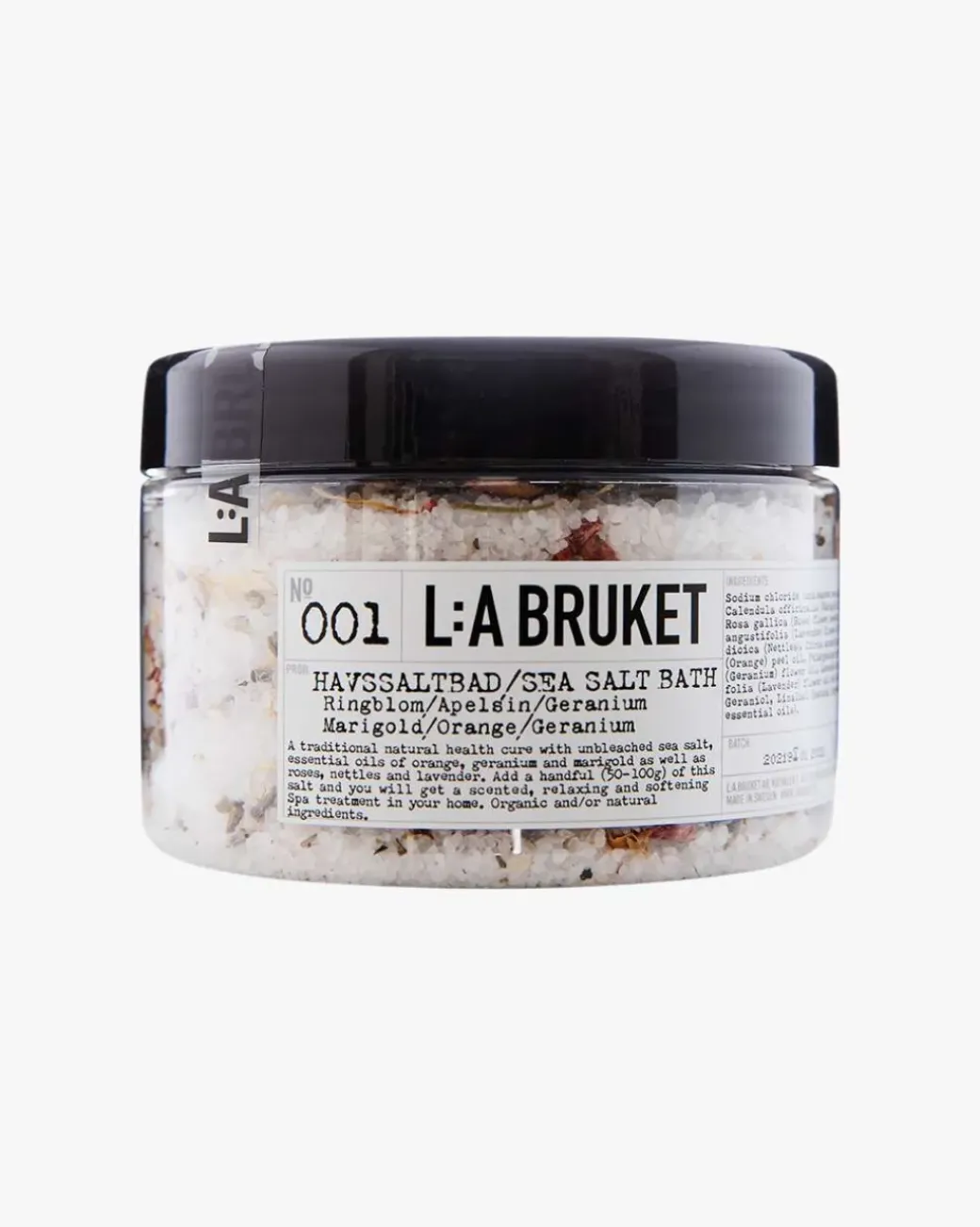 L:A Bruket 001 Bath Salt Marigold/Orange/Geranium er et badesalt beriket med ringblomst, appelsin og geranium. Basen av badesaltet vil rense og stimulere huden. Inneholder eterisk olje av ringblomst, appelsin og geranium som har beroligende, bakteriostatiske og reparerende egenskaper. Motvirker effektivt hudirritasjoner. Inneholder økologiske og/eller naturlige ingredienser.