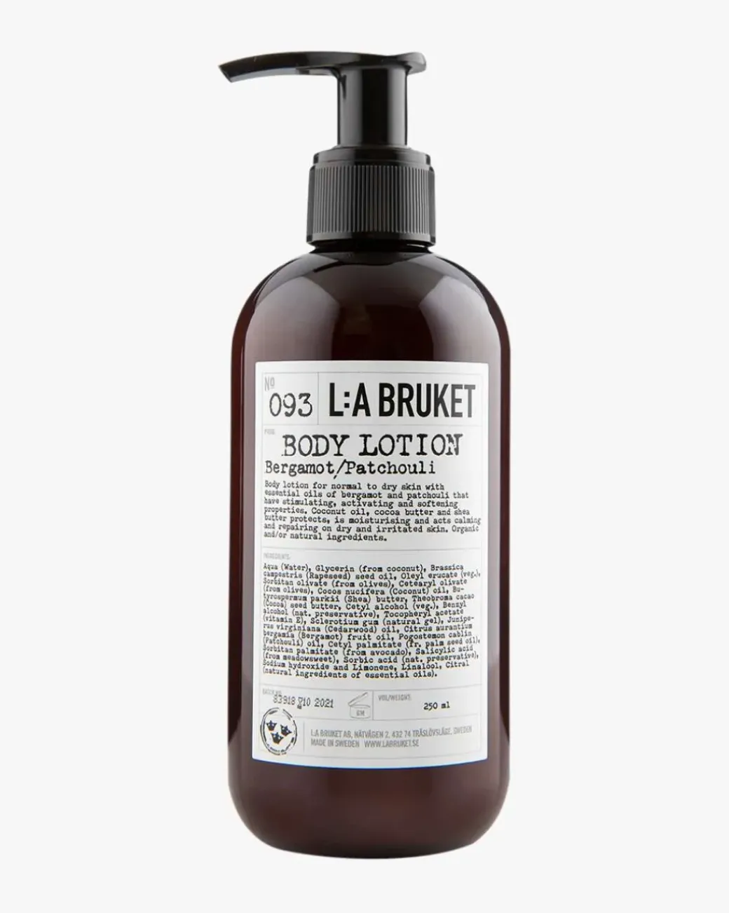 L:A Bruket 093 Body Lotion Bergamot/Patchouli er en pleiende body lotion som absorberes lett og forhindrer uttørking av huden, samt stimulerer cellefornyelsen. Inneholder sheasmør, kokosolje, kakaosmør og roseolje. Inneholder økologiske og/eller naturlige ingredienser.