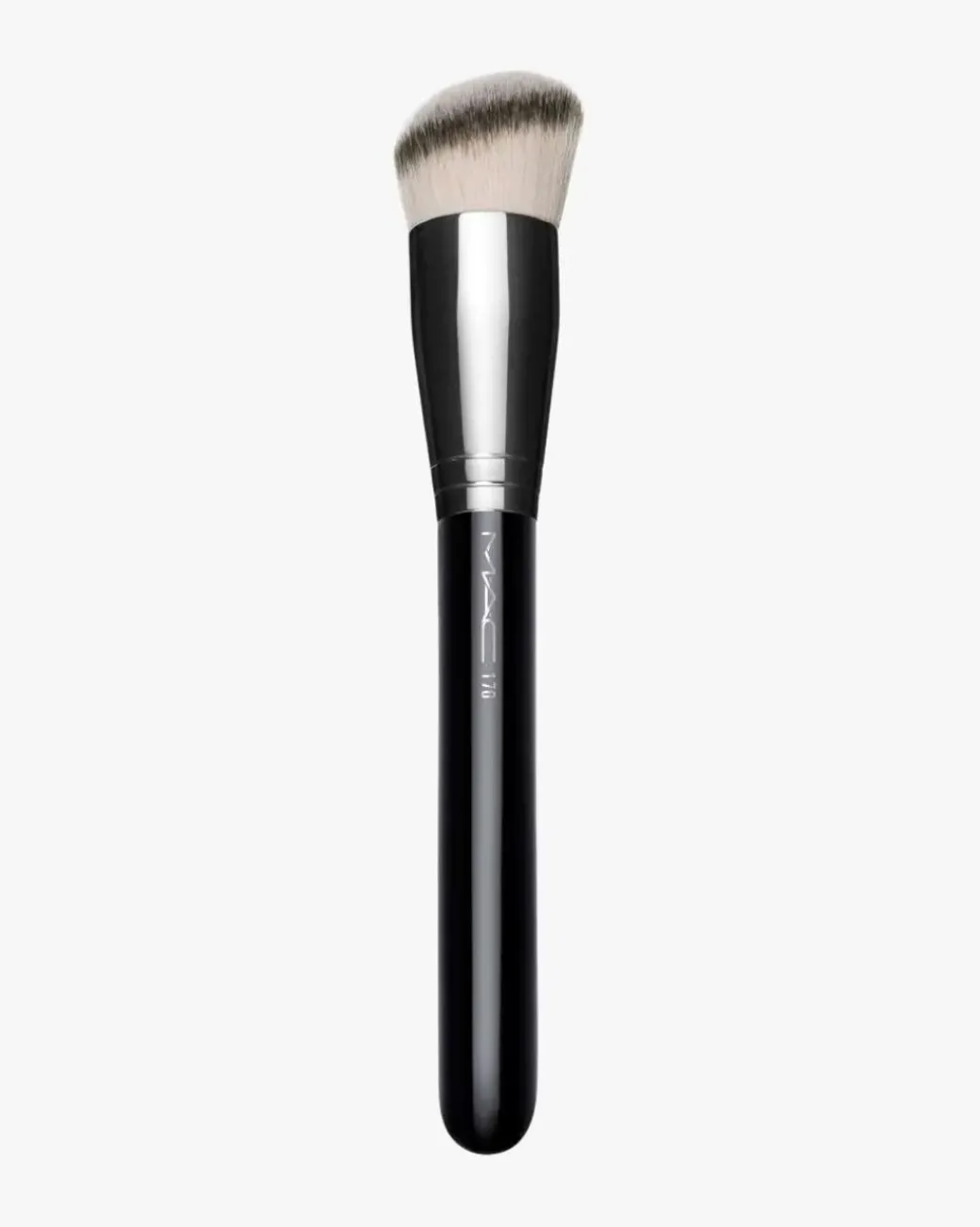 MAC Cosmetics 170 Synthetic Rounded Slant Brush har en rund og lett kuppelformet fasong, som gjør denne børsten perfekt til å legge, jevne og tone ut tykke og flytende produkter med en glatt og jevn finish. Fungerer særlig godt med MAC Studio Tech. MACs profesjonelle børster er håndlaget og sammensatt av de beste kvalitetsmaterialer. Børstene har håndtak av tre med nikkelbelagte messinghylster.
