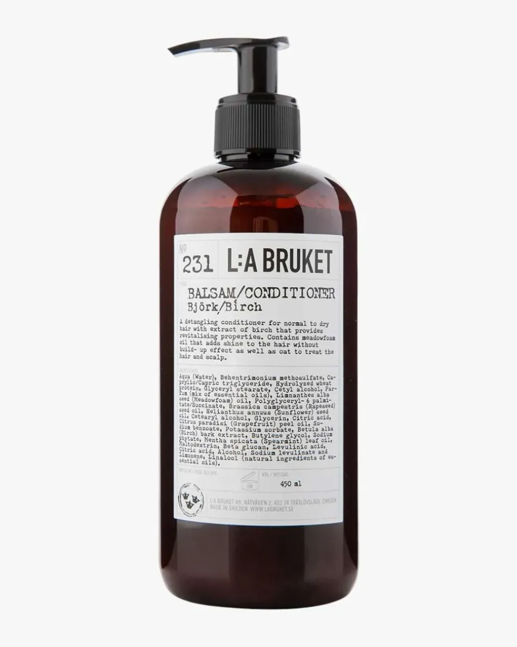 L:A Bruket 231 Conditioner Birch er en hydreringen og pleiende balsam for normalt, tørt eller hår som har en tendens å flokke seg. Inneholder ekstrakt av bjørk, som tilfører revitaliserende egenskaper, engskumolje, som gir glans til håret, samt havre for å behandle hår og hodebunn.