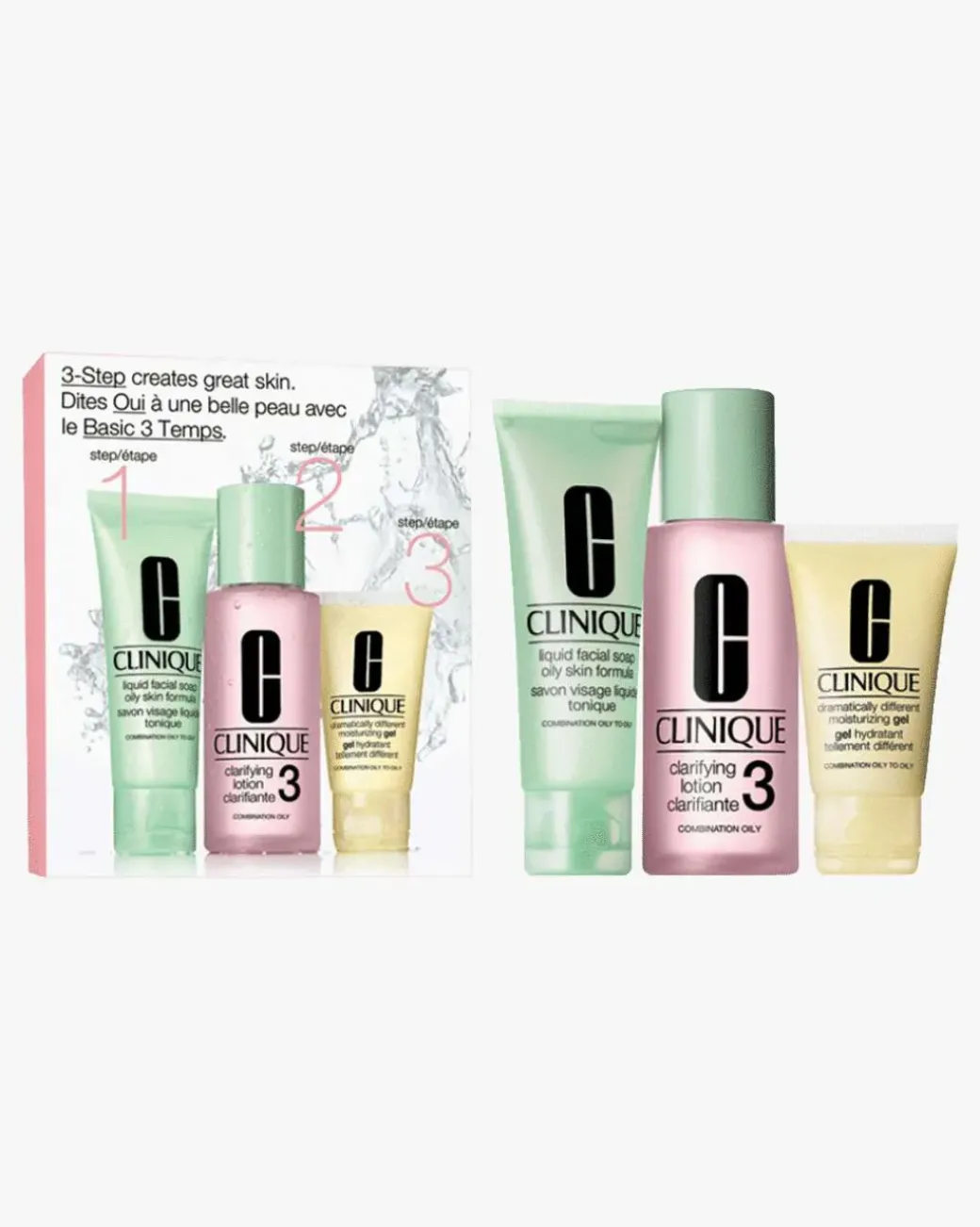 Clinique 3-Step Skin Care Intro Set har alt det du trenger for en vakker hud. En effektiv basishudpleie utviklet av hudleger der hvert trinn forbereder huden til det neste. Rens, eksfolier og fukt. Skreddersydd til en fet hud. Settet inneholder: Liquid Facial Soap 50 ml, Clarifying Lotion 3 100 ml og Dramatically Different Moisturizing Gel 30ml.