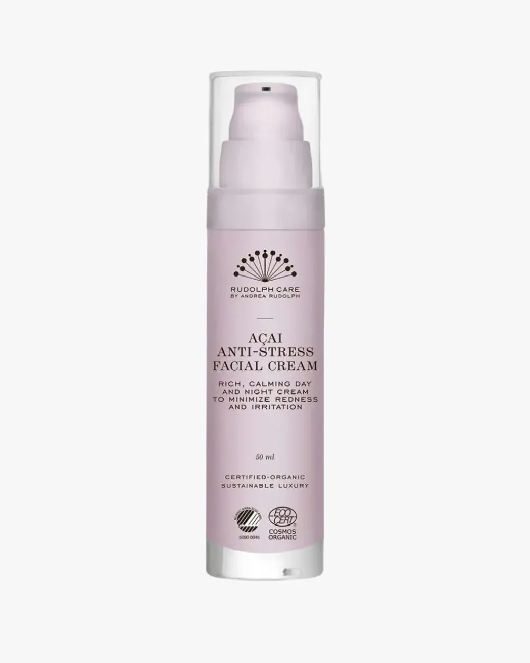 Rudolph Care Acai Anti-Stress Facial Cream er en ansiktskrem med fem forskjellige økologiske og pleiende oljer. Det høye oljeinnholdet gir en fyldig konsistens. Kremen inneholder ingredienser som virker ekstra beroligende og demper og lindrer rødhet, kløe og tørr hud. Perfekt til hud som er utsatt for stress på grunn av hektiske hverdager, sol, lys, vind, vær, aircondition, forurensning og så videre. Anti-Stress Facial Cream forebygger aldringstegn og kan brukes i alle aldre og til alle hudtyper.