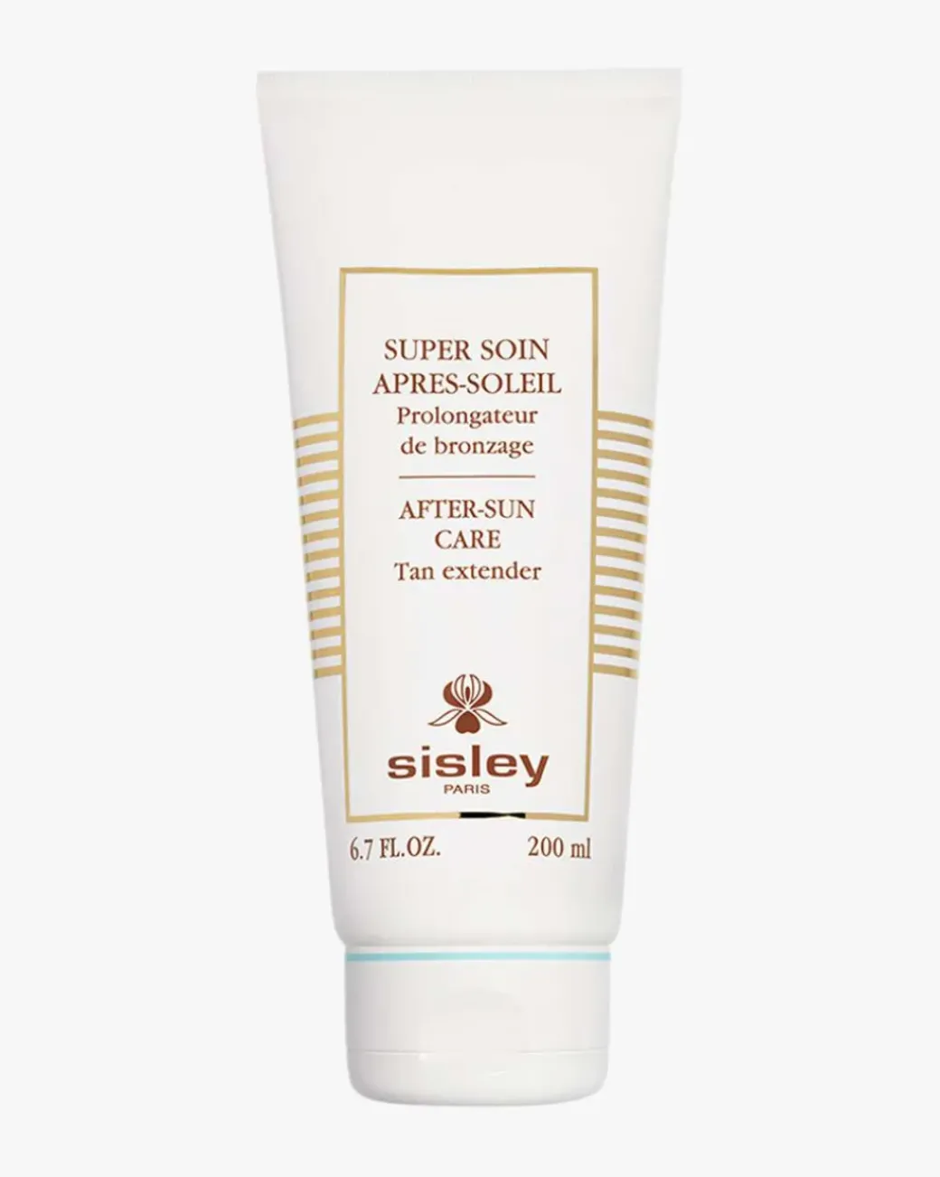 Sisley After Sun Care. Super Soin Après-Soleil Corps er et hudpleieprodukt som er spesielt utviklet for å lindre huden, gi den fuktighet og kjøle den ned etter soleksponering. Formelen, som er rik på lindrende ingredienser (andirobaolje, alfa-bisabolol), virker lindrende og demper følelsen av varm hud. Fuktighetsgivende og helende egenskaper av bassiasmør, ekstrakter av steviablad og glyserinplante, gir næring til huden og en følelse av mykhet. Kombinasjonen av lavdoserte selbruningsingredienser (DHA og erytrulose) bedrer brunfargen. Den flytende, oljefrie konsistensen trekker raskt inn i huden.