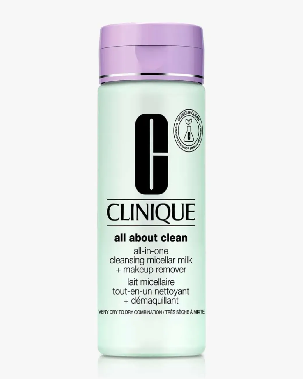 Clinique All-In-One Cleansing Micellar Milk + Makeup Remover, Dry Combination. Kremet formel som renser bort forurensning og urenheter og fjerner ansikts-, leppe- og øyesminke i ett beroligende, men likevel forfriskende trinn, uten å forstyrre hudens naturlige fuktighetsbalanse. Egnet for sensitive øyne og kontaktlinsebrukere. Utløser ikke akne. Passer best til en normal til tørr hud.