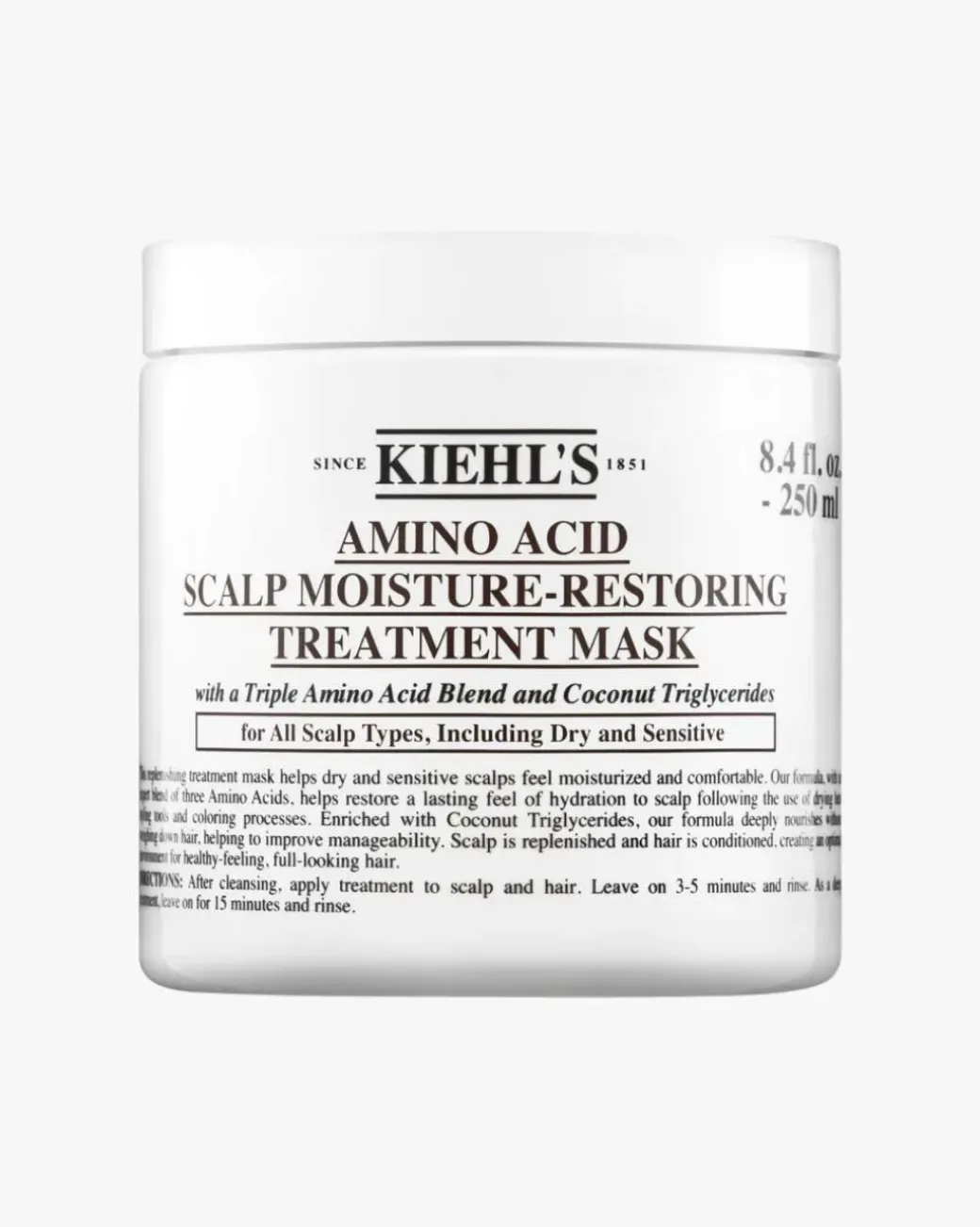 Kiehl’s Amino Acid Treatment Mask For Scalp & Hair er en fuktighetsgivende hodebunnsmaske som lindrer tørr hud og ubehag i hodebunnen. Denne skrubben gjenoppretter fuktighetsbalansen i hodebunnen og beskytter hodebunnen mot hardt vann og styling. Masken inneholder både tre aminosyrer og triglyserider utvunnet fra kokosolje. Bruk denne hodebunnsmasken for å oppnå varig fuktighet i hodebunnen og et sunnere hår.