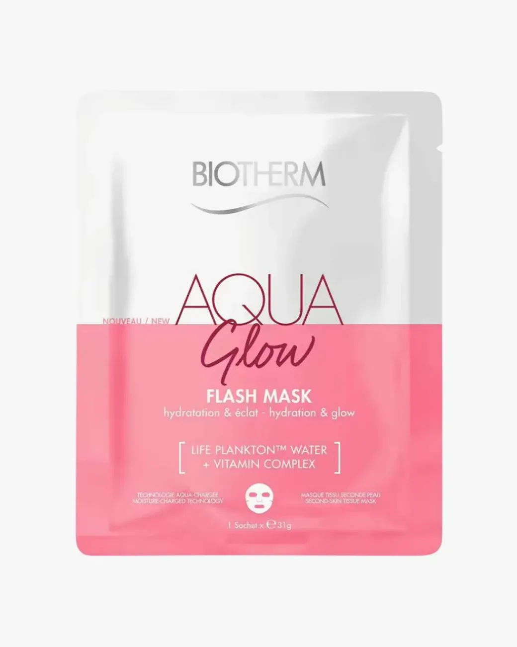 Biotherm Aqua Super Mask Glow er en sheet maske som inneholder Life Plankton Wate som tilfører huden fukt. Ansiktsmasken er utviklet til å holde på mer serum enn andre klassiske sheet masker. Den inneholder Vitamin C Complex som hjelper med å tilføre huden glød. Masken gir huden rikelig med fukt, hudtonen blir jevnere og den gir huden et glødende resultat. Umiddelbar effekt, men langvarig resultat forekommer ved jevnlig bruk.