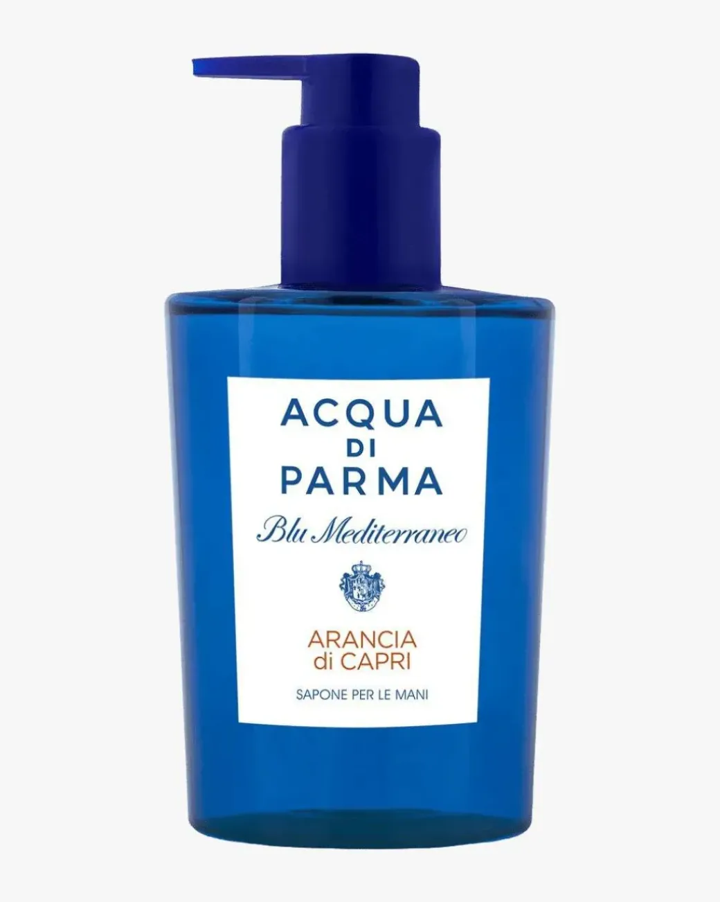 Acqua Di Parma Blu Mediterraneo Arancia di Capri Hand Wash er en håndsåpe med de friske, solfylte notatene Arancia di Capri. For de som foretrekker flytende såper kommer denne håndsåpen i en praktisk dispenser. Beriket med dyrebare aktive ingredienser – dypnærende panthenol samt forfriskende og beskyttende Aloe ekstrakt. Såpen danner et rikt, kremaktig skum i kontakt med vann, slik at huden blir behagelig parfymert og myk til berøring. Dispenseren leveres i et elegant Acqua di Parma design.