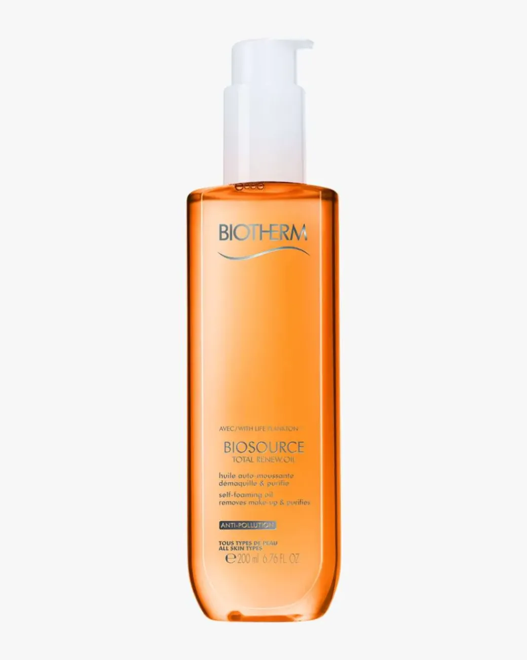Biotherm Biosource Total Renew Oil Cleanser er en selvskummende renseolje som fjerner makeup og renser huden. Huden blir ren og med en vakker glød. Renseoljen inneholder algen Life Plankton™, som finnes i de varme thermalske kildene i Frankrike som tilfører huden fukt.