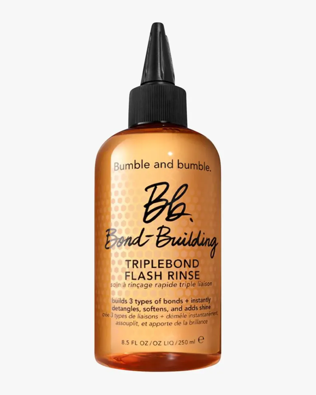 Bumble and bumble Bond-Building Triplebond Flash Rinse er en hurtigvirkende hårbehandling som bygger de tre essensielle hårbindingene (hydrogen-, ioniske- og – den sterkeste av de tre – kovalente bindinger) for å styrke håret fra innsiden og ut på et øyeblikk. Gir lett fuktighet og etterlater håret skinnende, flokefritt og mykt. Hjelper mot matthet og tørrhet (synlige tegn på skadet hår).