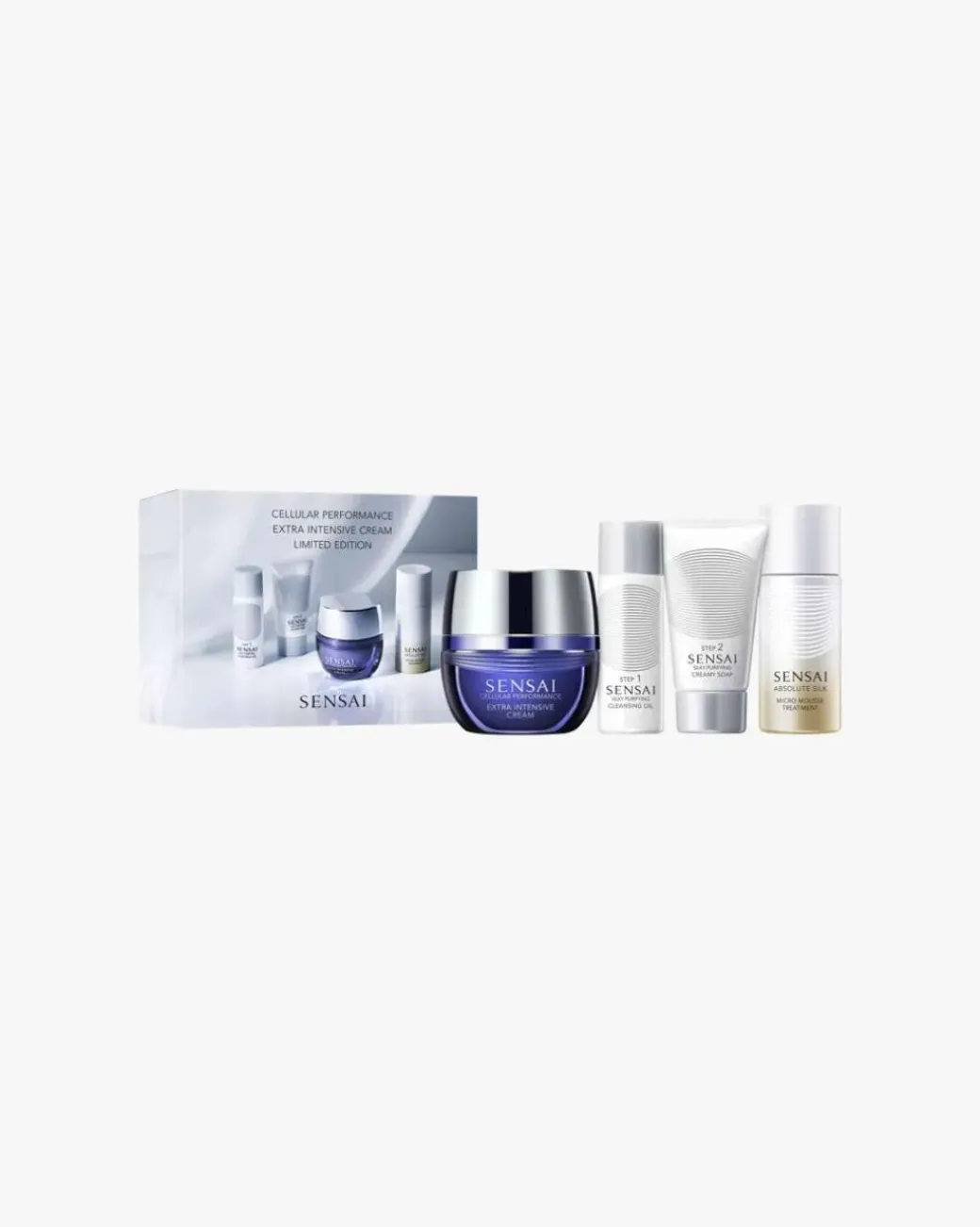 Settet inneholder: Cellular Performance Extra Intensive Cream 40ml, Silky Purifying Cleansing Oil 30ml, Silky Purifying Creamy Soap 30ml og Absolute Silk Micro Mousse Treatment 30ml.