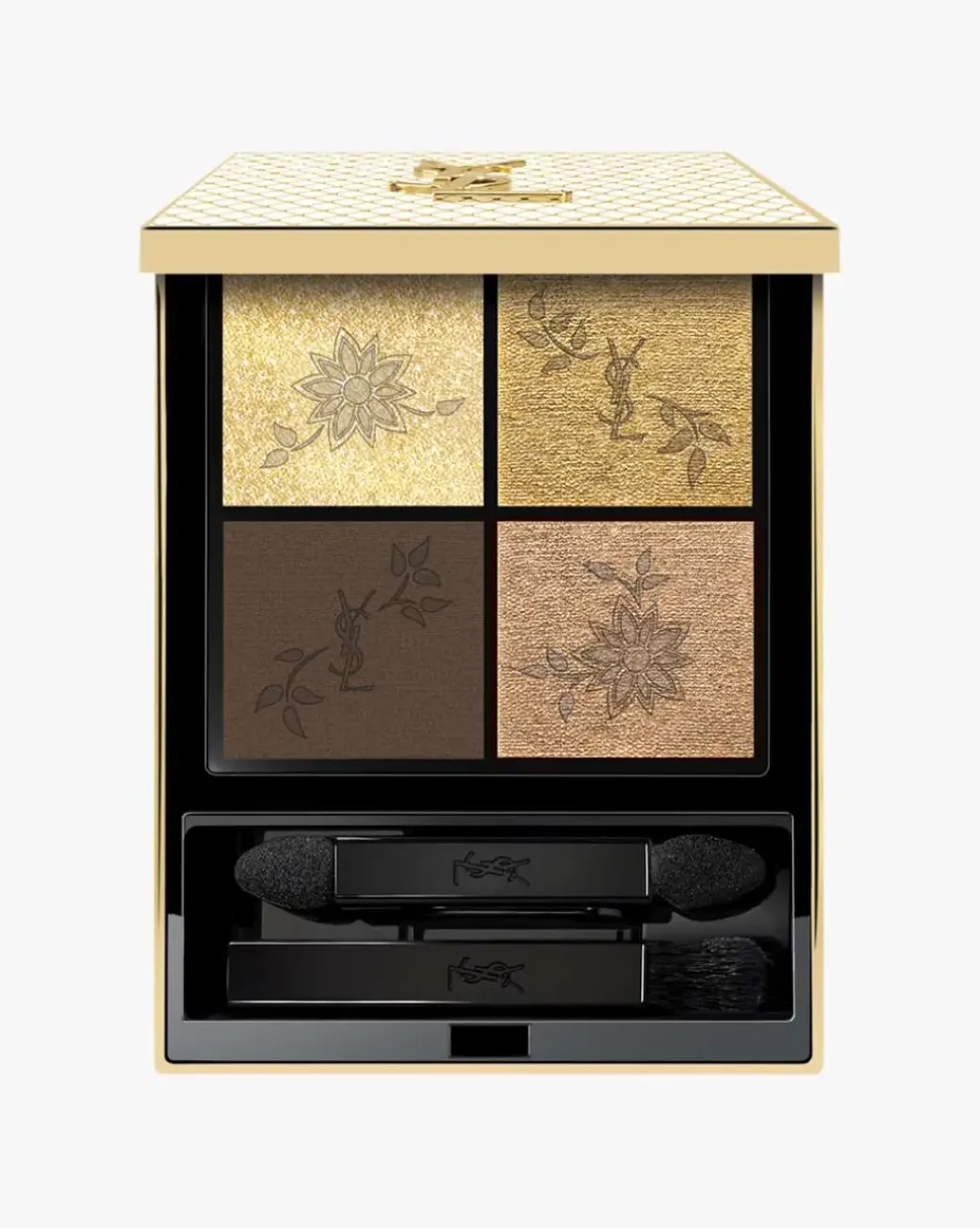 Yves Saint Laurent Couture Baby Clutch Palette Holiday Edition. Denne julen inviterer YSL Beauty deg til å tre inn i vårt vintereventyr. Våg å oppdage den nye Couture Mini Clutch i nyanse 024 Golden Lace i begrenset utgave, emballert i en unik hylse i hvit lakk og gullfarget résille. Bruk de fire nyansene som former øynene (merket med juleblomster), for å uttrykke din edge med fargesterke pigmenter, for en skimrende look.