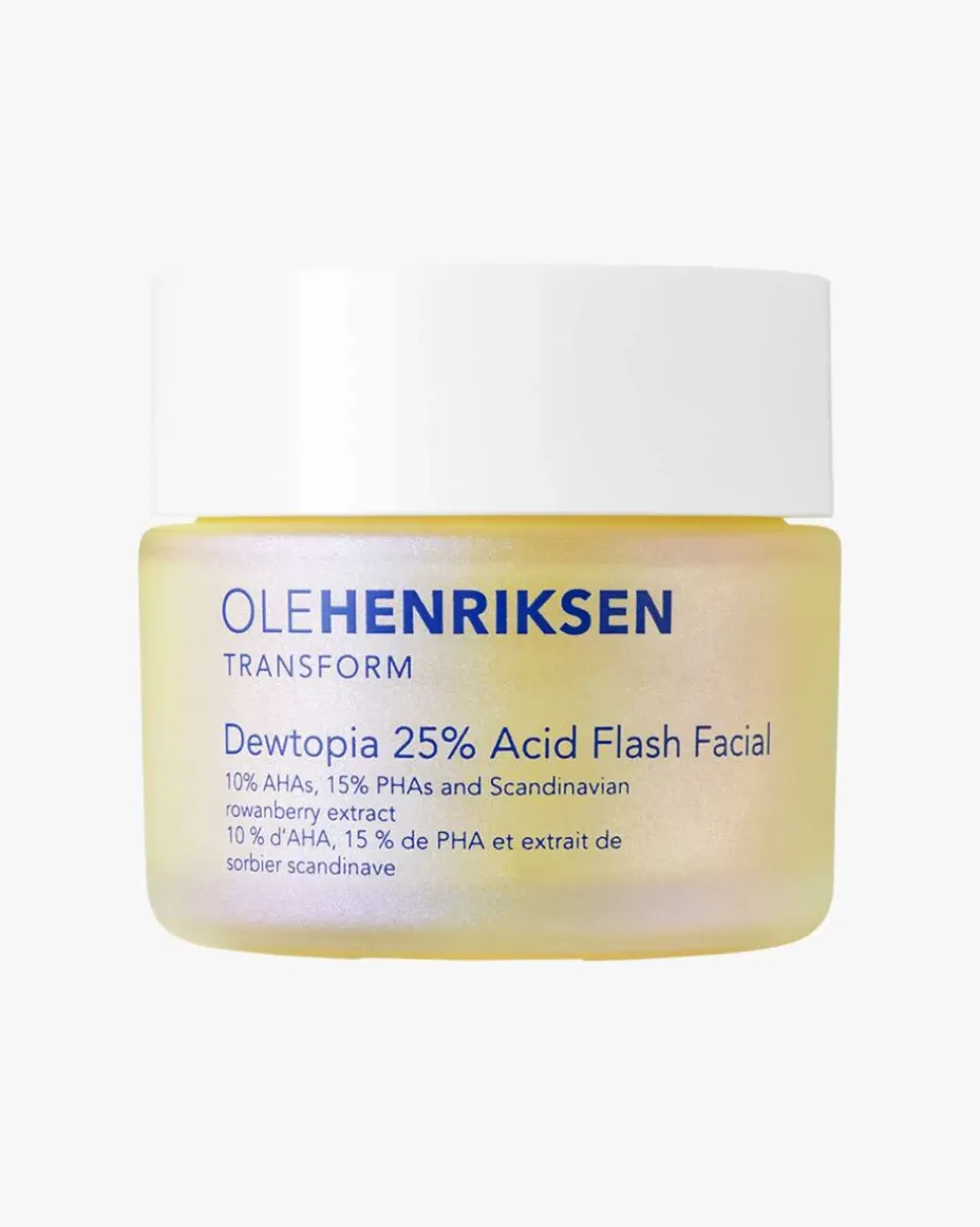 Ole Henriksen Dewtopia 25% Acid Flash er en kraftfull ansiktsmaske fullpakket med 25% AHA- og PHA-syrer som jevner ut tekstur, lysner, reduserer fine linjer, rynker og porer, og forbedrer hudens klarhet på bare 5 minutter*.