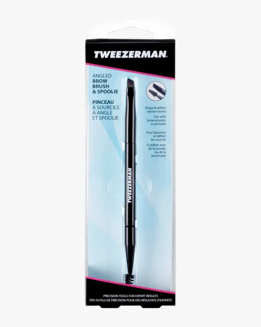 Tweezerman Dual Ended Angled Brow Brush er en brynspenn som har en vinklet børste i den ene enden for presis forming og definering av bryn, med den tynne tuppen ideell for å lage hårlignende strøk. I motsatt ende jobber spoolien for å blande ut produktet og børste hårene på plass. Brynbørsten er laget med syntetisk bust og kan brukes med brynspudder eller pomade.