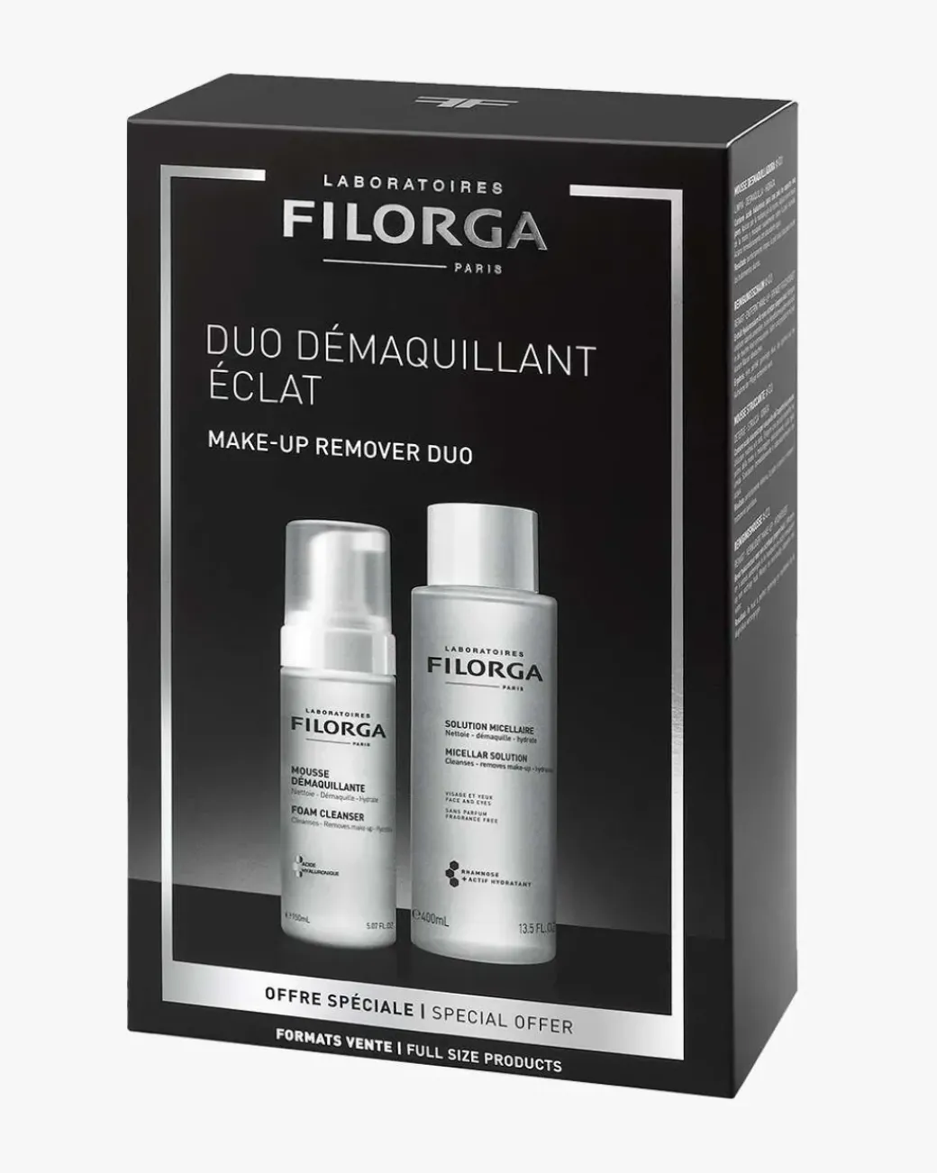 Filorga Duo Cleansers inneholder to skånsomme renseprodukter til ansiktet. Begge kan brukes hver for seg, eller sammen for en optimal rengjøring av huden. Foam Cleanser renser effektivt og fjerner sminken på huden, samtidig som den forbereder huden for påfølgende produkter. Produktet gir masse fukt og virker beroligende. Skummet er lett å jobbe med og gjør rengjøringen til en behagelig opplevelse. Passer til alle hudtyper, til og med sensitiv hud. Micellar Solution er en dyprensende toner som fjerner sminke og smuss fra huden. Kan brukes som toner eller rengjøring. Perfekt for deg som ønsker en enkel og rask rengjøring uten vann. Beriket med fuktighetsgivende og mykgjørende ingredienser. Passer til alle hudtyper, til og med sensitiv hud.