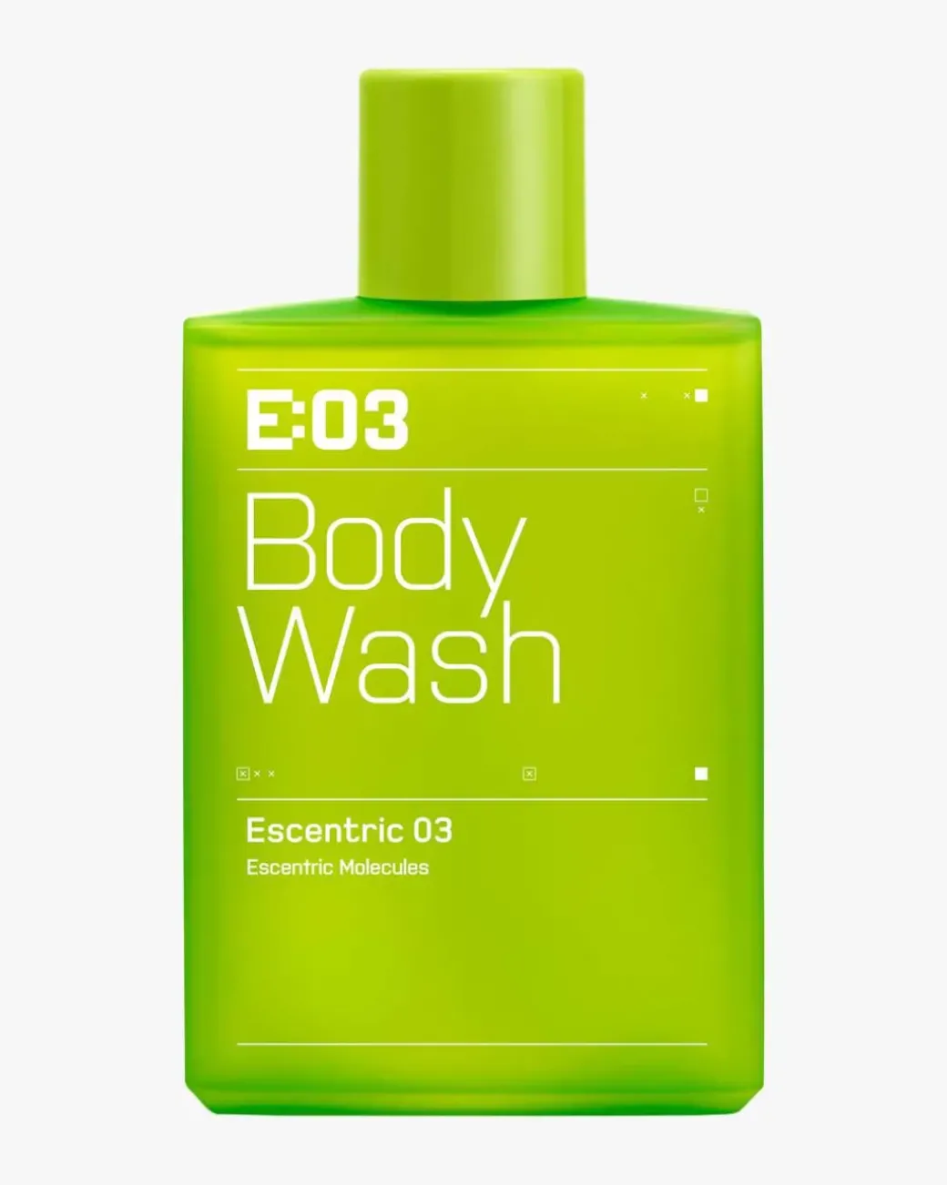 Bygget rundt en glatt og treaktig Vetiver-molekyl med en oppkvikkende grapefruktaccent, er Escentric 03 Body Wash beriket med frisk og oppfriskende lime skall, ingefær, grønn pepperkorn og musk, som etterlater kroppen innhyllet i de urteaktige notene av Escentric 03. Mens det duftberikede skummet revitaliserer sinnet og skånsomt renser kroppen, nærer og hydrerer de plantebaserte fuktighetskremene huden.