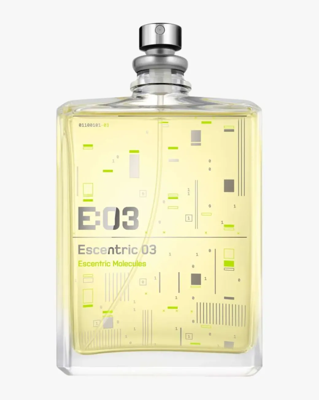 Escentric Molecules Escentric 03 er en hyllest til den mer kjente siden av vetiver og dens mørke, litt eksotiske, treaktige duft. Escentric 03 fokuserer på Vetiveryl Acetate i en formel som hyller de tre røttene som brukes i parfymen: vetiver, ingefær og orris, som er utvunnet fra røttene til den florentinske iris. Vetiverylacetat kan beskrives som et hybridmolekyl, halvt naturlig, halvt syntetisk. Det er en fraksjon av vetiverolje, destillert fra røttene til et indisk gress, som deretter «krysses» med eddiksyre for å fjerne de bitre og læraktige aspektene ved roten. Ingefær dominerer den levende toppnoten sammen med grønn og krydret limeskall og pepperkorn. Hjertet er rikt med fløyelsmyk orris, egyptisk sjasmin og tenoter. Bunnotene understreker den mørkegrønne treheten til vetiver sammen med sedertre, myke balsamer og musk.