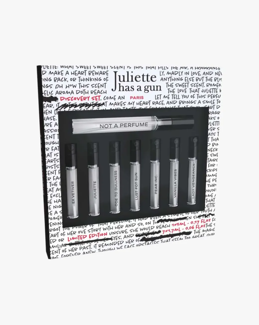 Settet inneholder: Not a Perfume EdP 5ml, Pear Inc EdP 1,7ml, Vanilla Vibes EdP 1,7ml, Lady Vengeance EdP 1,7ml, Lust for Sun EdP 1,7ml, Ode to Dullness EdP 1,7ml, Juliette EdP 1,7ml og Ex Vetiver EdP 1,7ml.
