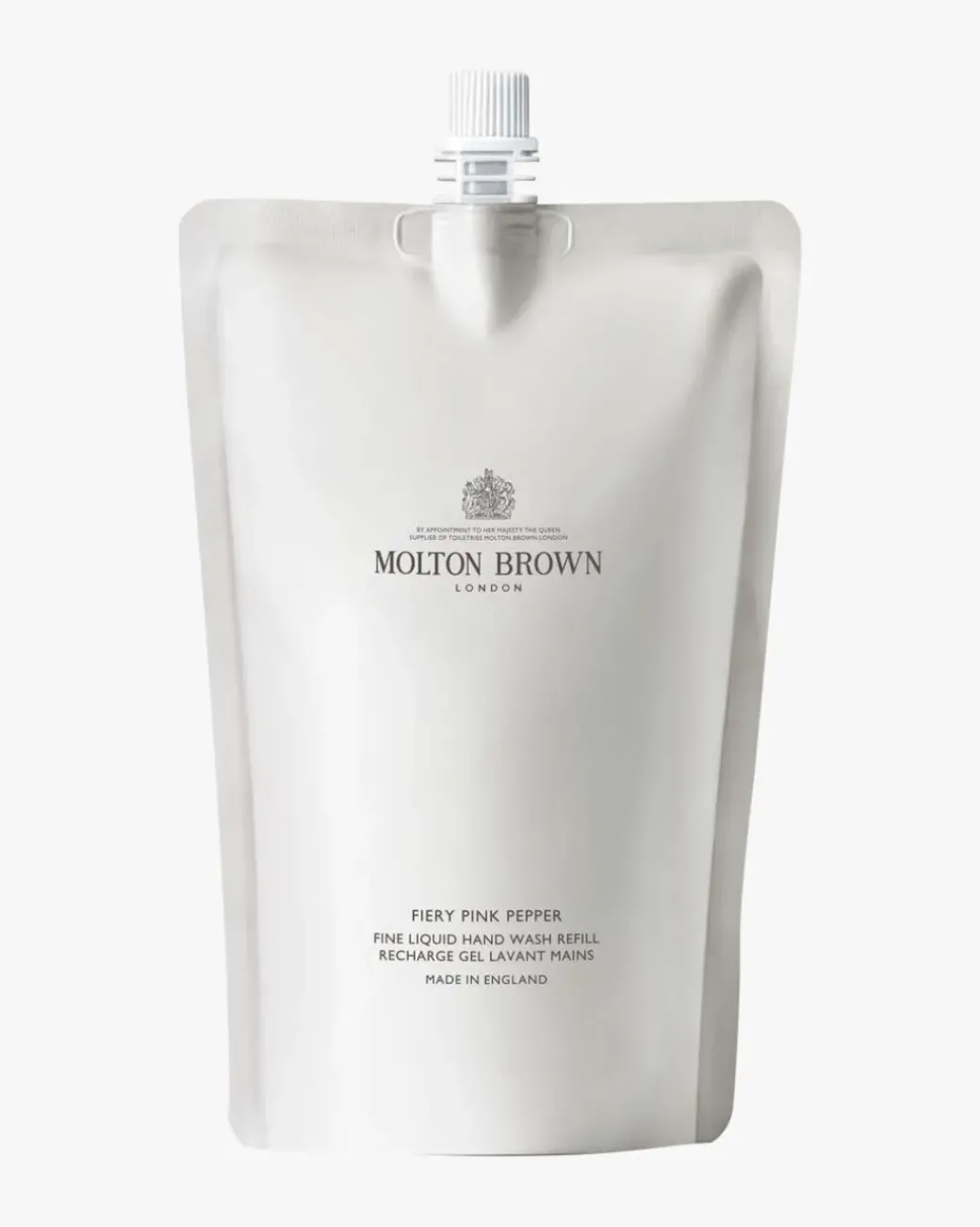 Molton Brown Fiery Pink Pepper Fine Liquid Hand Wash Refill. Etterfyll din Molton Brown plastflaske eller langvarige glassflaske med denne avfallsreduserende treaktig-krydrede håndsåperefill. Ulmende duftende med krydret rosa pepper, varm ingefær og rik patchouli.