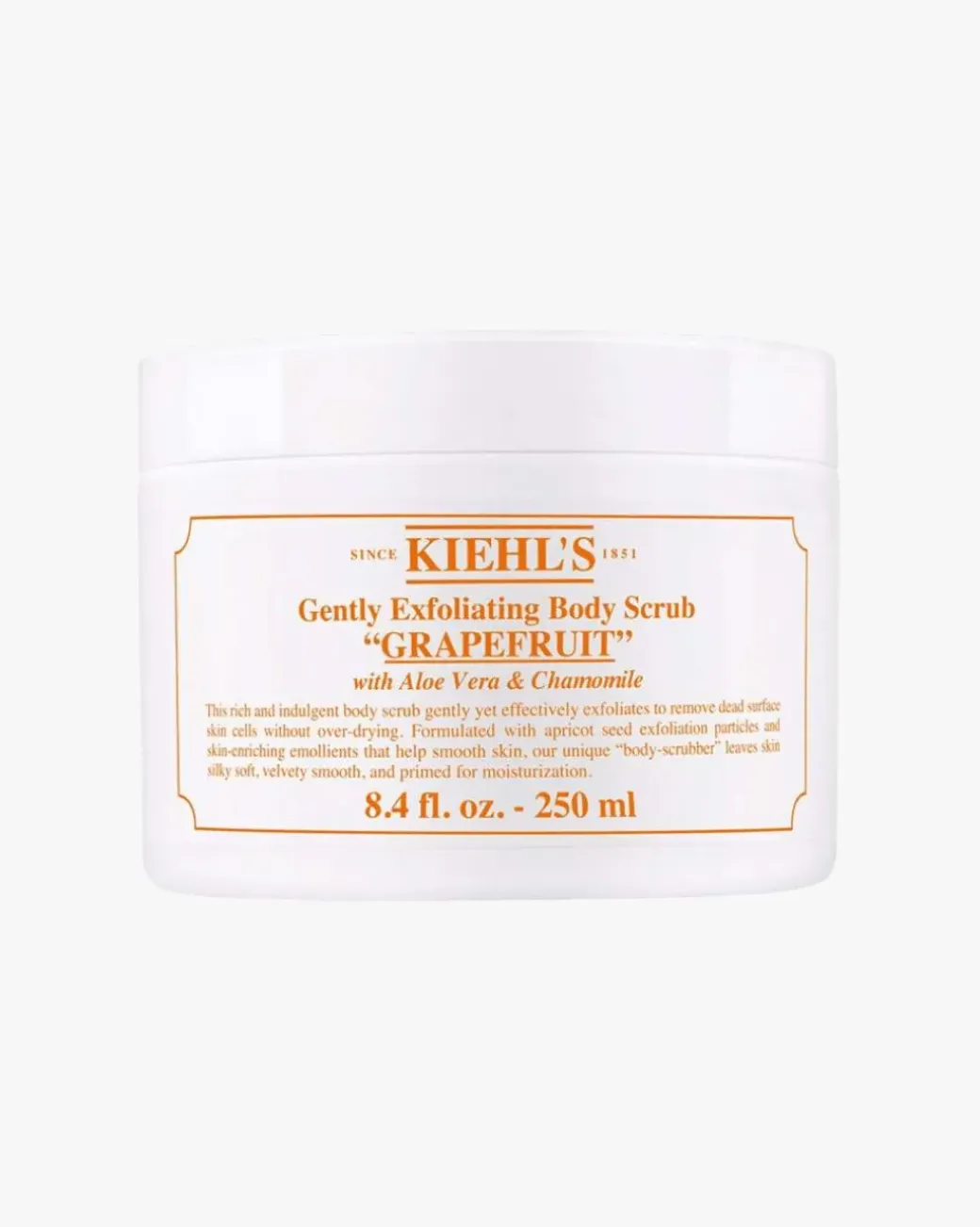 Kiehl’s Gently Exfoliating Body Scrub Grapefruit er en effektiv bodyscrub som fjerner skånsomt døde hudceller, uten å tørke ut huden. Inneholder naturlig eksfolierende partikler fra luffa cylindrica og havrekorn samt berikende fuktighetsgivende ekstrakter av aloe vera og kamille. Etterlater huden silkemyk, frisk og fuktighetsgivende. Lukter grapefrukt.
