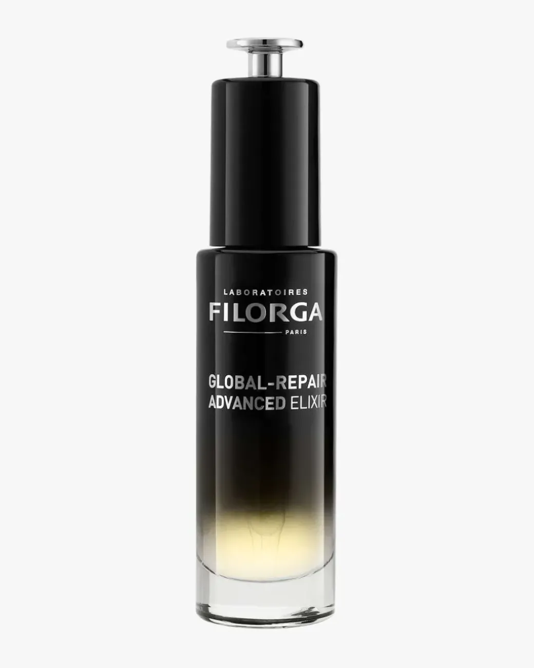 Filorga Global Repair Advanced Elixir. Filorga har utviklet en patentert reparasjonsfaktor som kombinerer ulike lipider for å oppmuntre hudens naturlige reparasjonsprosess. Med innovativ teknologi tilbyr Filorga Global Repair Advanced Elixir en ikke-kirurgisk løsning designet for å reversere synlig aldringstegn. Elixiren er beriket med essensielle oljer som Andiroba-olje, som regenererer epidermis og gjenoppretter elastisitet, mens Camellia-olje er rik på omega 3, 6 og 9, gir næring og opplyser huden over tid.
