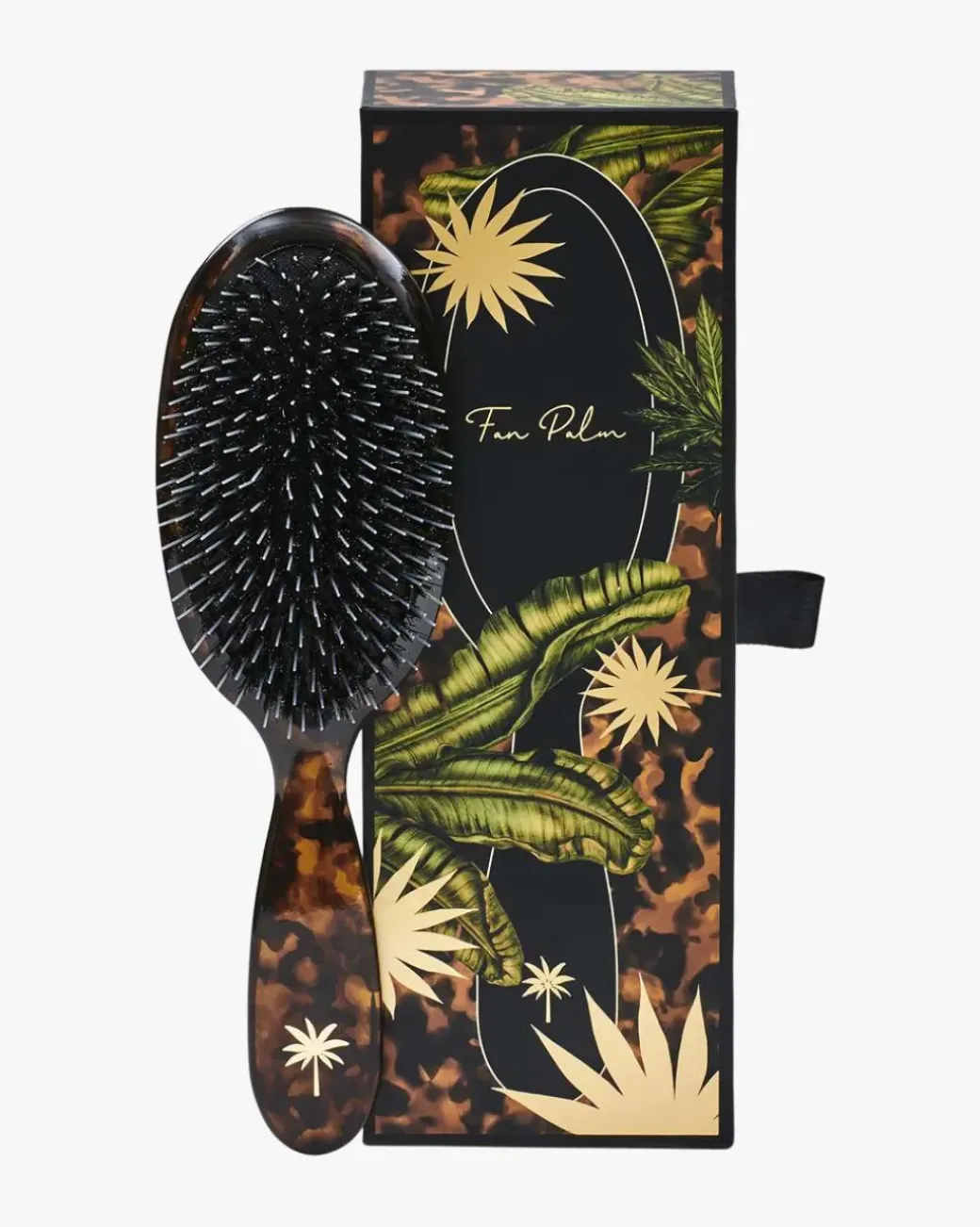 Fan Palm Tortoise Shell Medium Hair Brush har et vakkert gjennomsiktig design fra Fan Palms luksusutgave. Svin- og nylonbørste gir glans og glatthet til håret. Nylonbusten er lengre for forsiktig å stimulere hodebunnen og løsne håret mens villsvinbustene hjelper til med å fordele talg. Det stimulerer blodstrømmen til hårsekkene og de fleste finner ut at de kan redusere frekvensen av hårvask til hver tredje eller fjerde dag. Kommer i en lekker skuffeboks med gullfoliedetaljer.