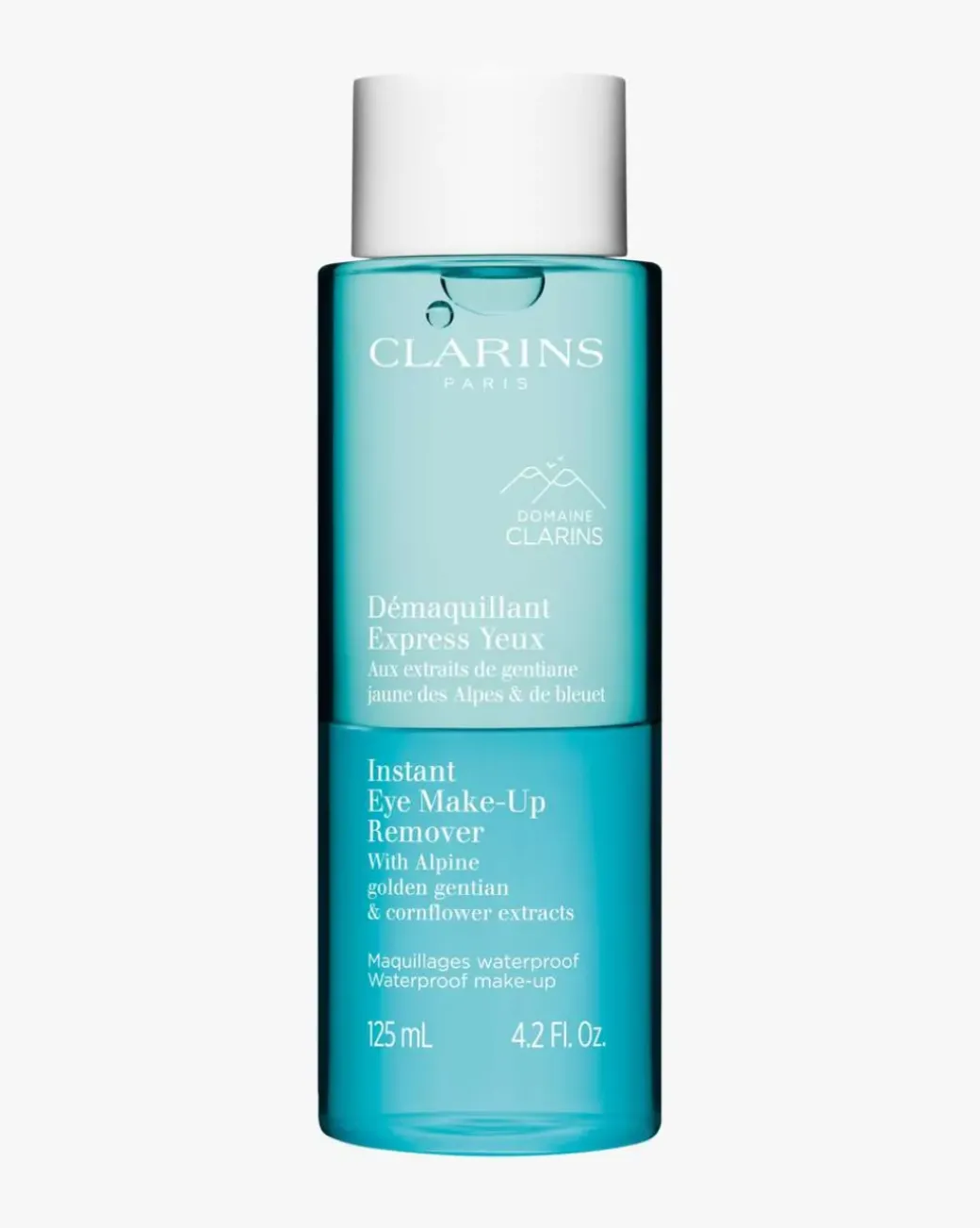 Clarins Instant Eye Make-Up Remover Bi-Phase er en øyesminkefjerner som er ideell for de som ofte bruker tung eller vannfast sminke og ønsker å pleie øyeområdet. Med sin Bi-Phase-formel, fjerner den effektivt vannfast sminke samtidig som den er skånsom mot huden. Produktet er beriket med økologisk ekstrakt av alpin gul gentian, dyrket i hjertet av Domaine Clarins, og økologisk kornblomstekstrakt, som virker beroligende på huden rundt øynene. Det inneholder også panthenol, som bidrar til å beskytte og styrke øyevippene.