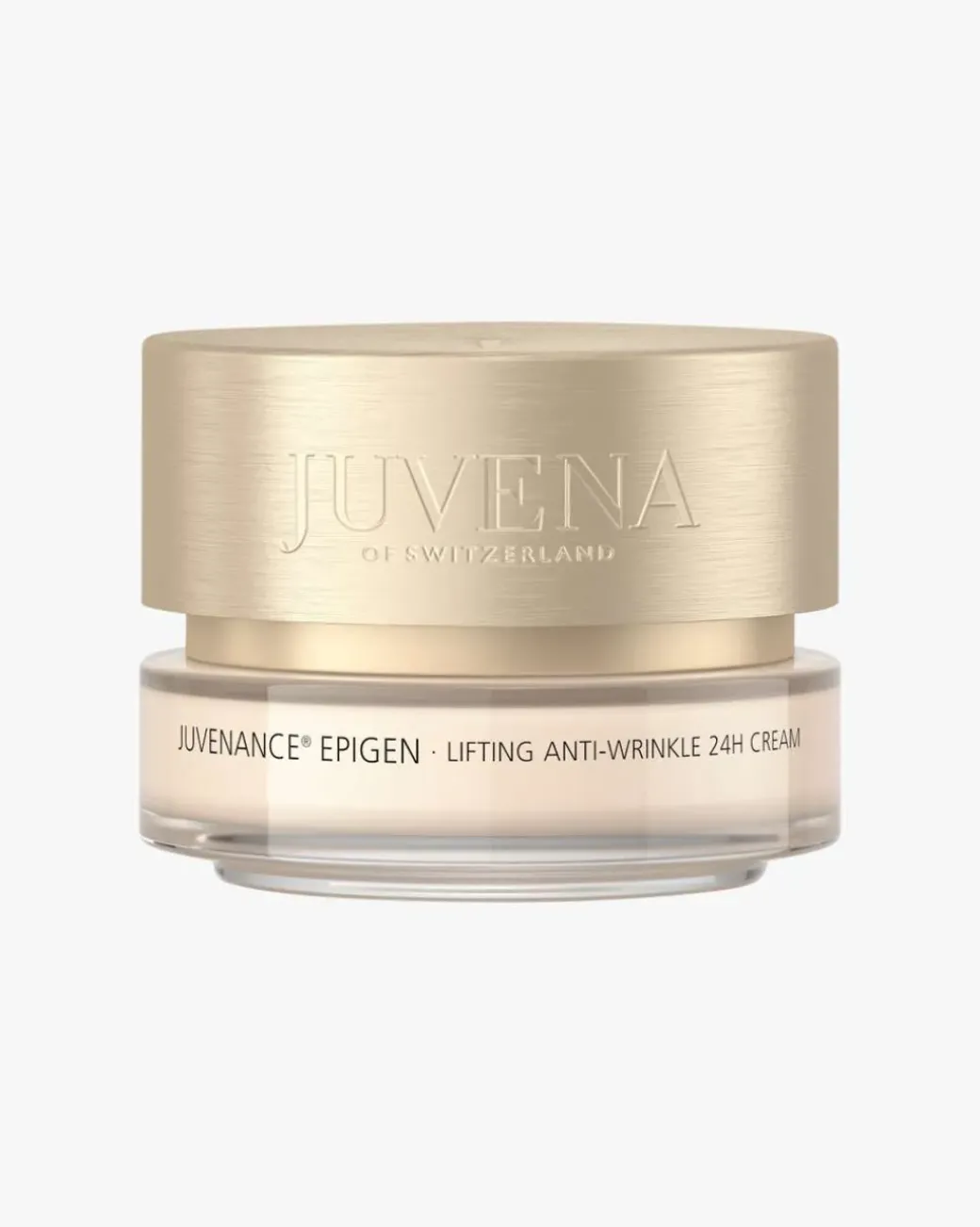 Juvena Juvenance Epigen Lifting Anti-Wrinkle 24H Cream er en kombinert dag- og nattkrem som gir huden tilbake sine konturer, spenst og elstisitet ved å redesigne hudens epigenetiske mekanismer til å intensivt stimulere kollagenproduksjonen igjen. Huden minnes på hvor godt den kan jobbe og viktige hudgener forhindres i å slå seg av.