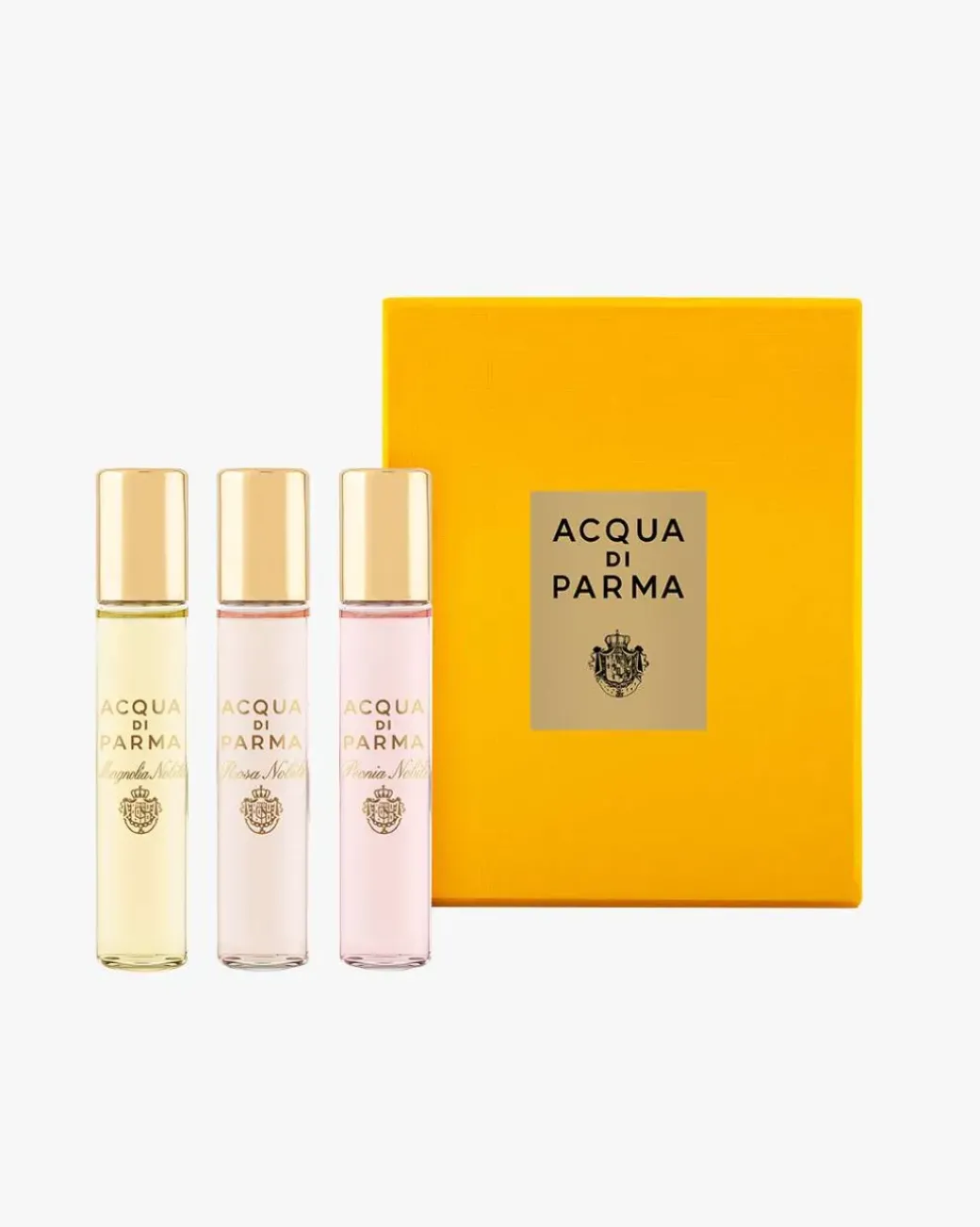 Acqua di Parma Le Nobili Roll-On Discovery Set gjør det mulig for deg å utforske flere av kreasjonene til Acqua di Parma. Inspirert av den eksklusive verden av de edle italienske hagene, der den reneste skjønnheten dyrkes og de mest majestetiske blomstene blomstrer. Oppdag Magnolia Nobile, Rosa Nobile, Peonia Nobile i et bærbart 12ml-format.
