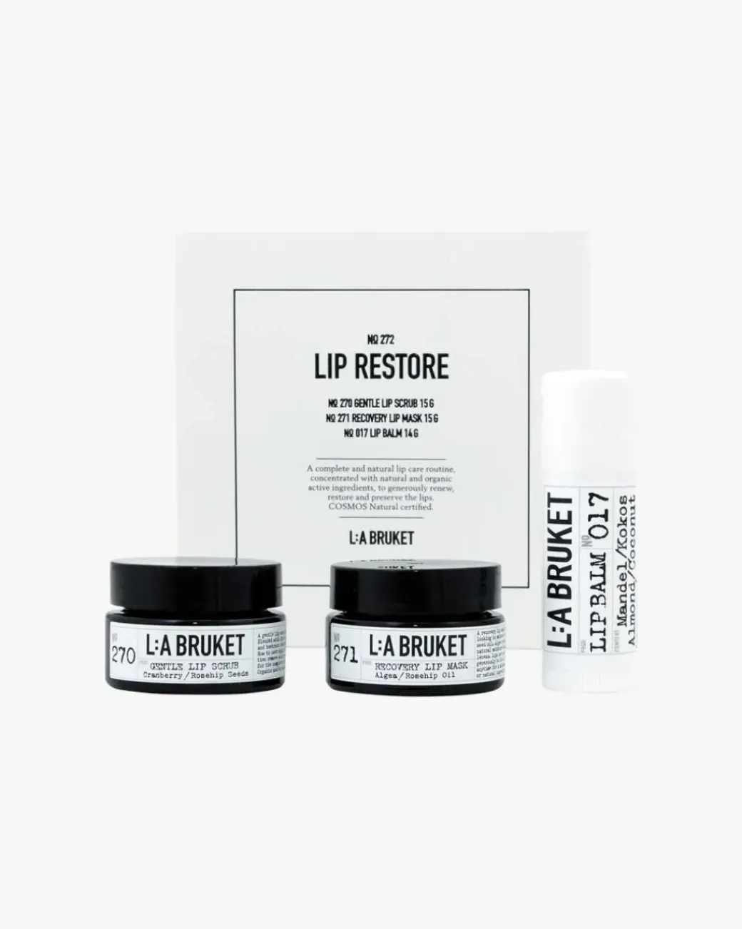 L:A Bruket Lip Restore Kit er det ultimate kittet for velstelte lepper. Renser, eksfolierer, fukter dypt og beskytter den følsomme huden på leppene. Kittet inneholder Gentle Lip Scrub, Recovery Lip Mask og Lip Balm.