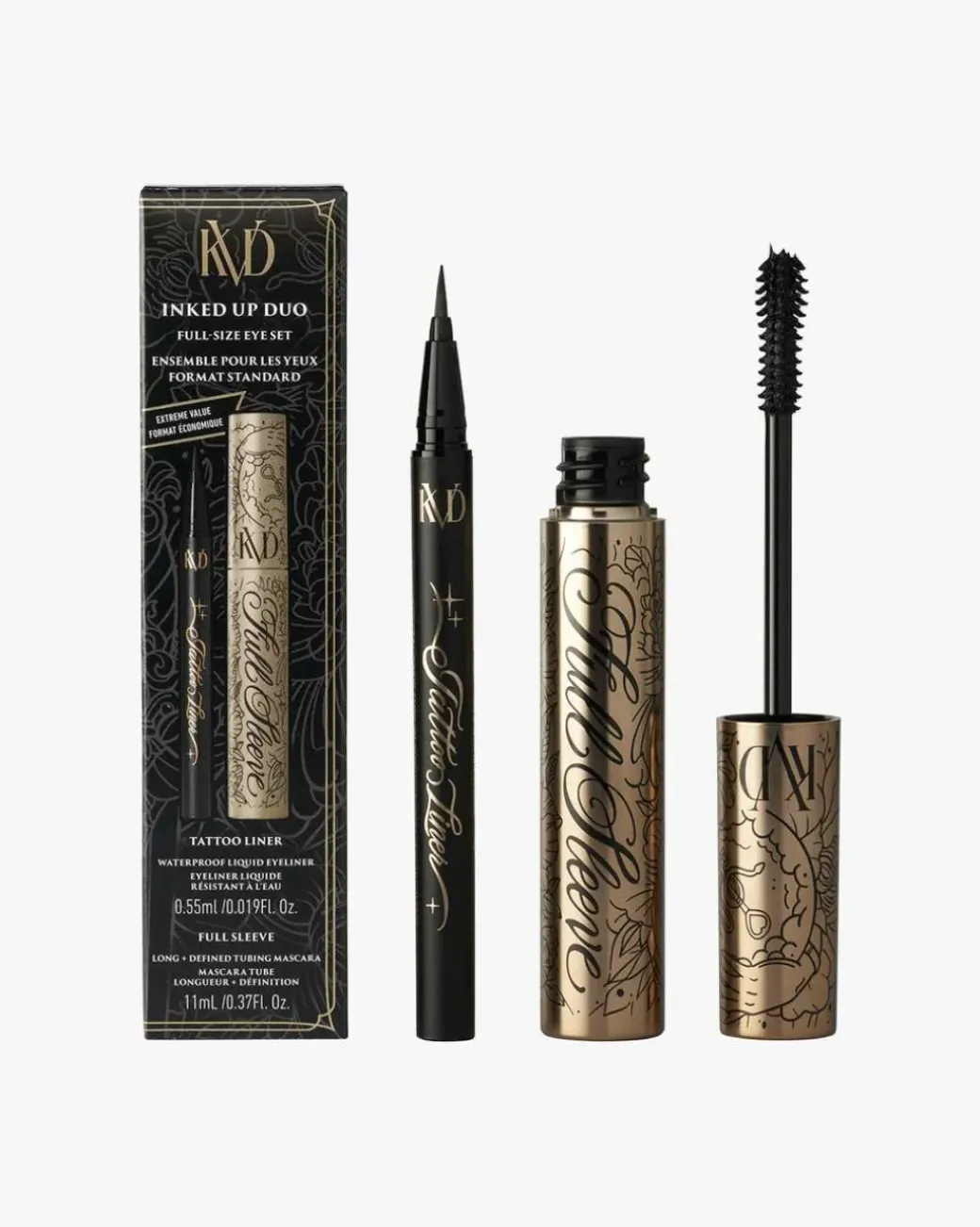 KVD Beauty Mascara + Tattoo Liner Duo Set. Et ekstremt prisgunstig sett med bestselgeren Tattoo Liquid Liner i full størrelse for ultrapresise linjer og Full Sleeve Tubing Mascara for lange, definerte vipper.