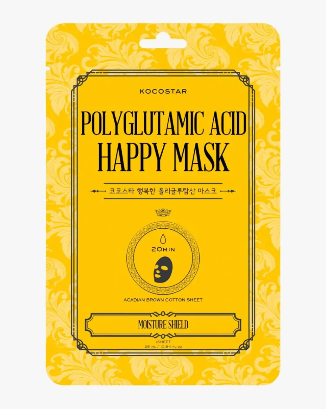 Kocostar Polyglutamic Acid Happy Mask er en intensivt fuktighetsgivende sheet mask, ideell for alle hudtyper, særlig for tørr og dehydrert hud. Denne formelen inneholder polyglutaminsyre, en kraftfull peptid utvunnet fra fermenterte soyabønner, kombinert med seks typer hyaluronsyre og mandelolje. Dette samspillet trekker og holder på fuktigheten i huden over lengre tid, noe som resulterer i en umiddelbart glattere og mer smidig hud. I tillegg tilfører plante-basert kollagenekstrakt ekstra fuktighet og gir en plumpende effekt. Masken er laget av 100% miljøvennlig, naturlig brun bomull som sitter tett mot huden.