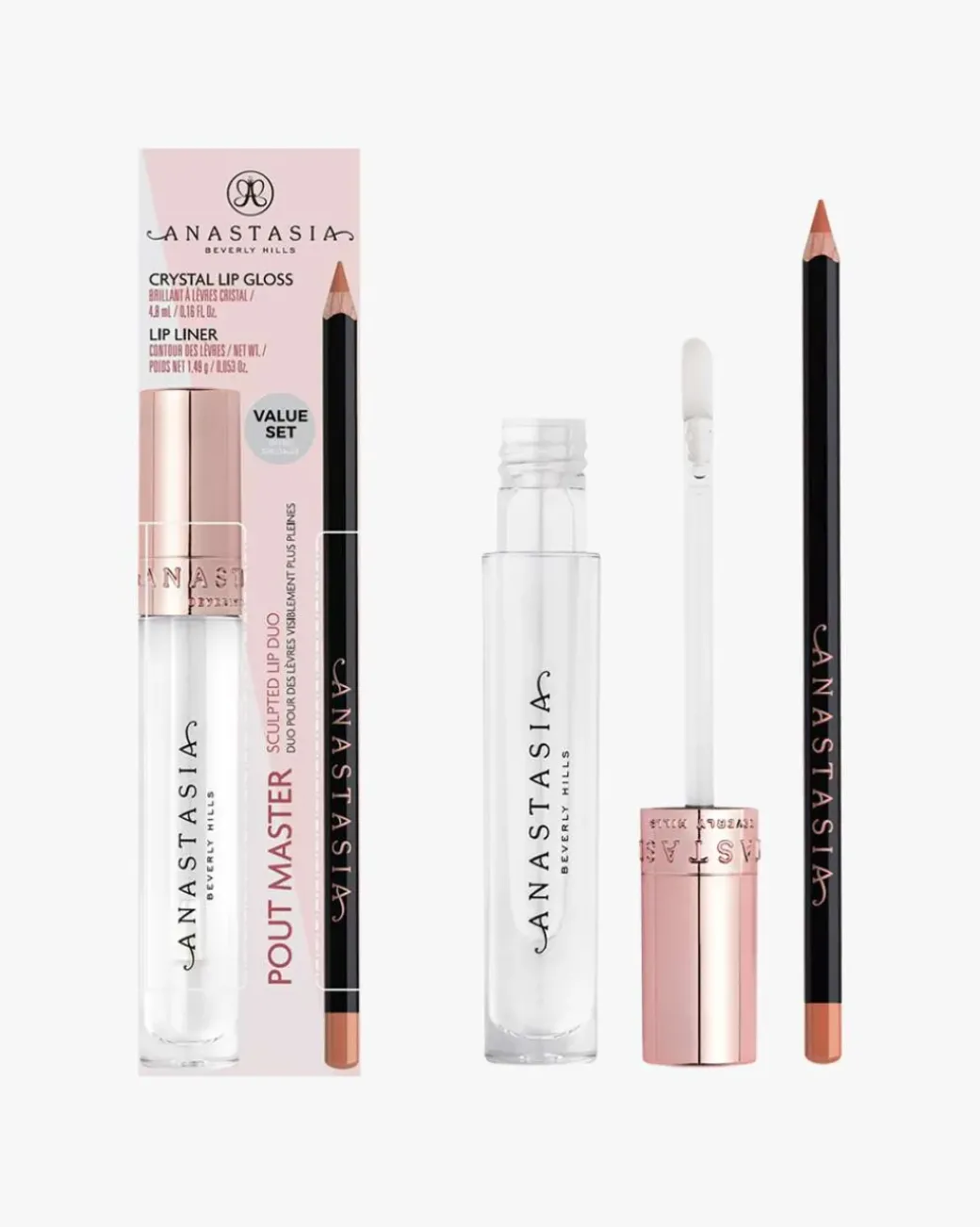 Anastasia Beverly Hills Pout Master Lip Kit. Hvis du ønsker å perfeksjonere den ettertraktede, skulpturerte leppe-looken, møt din Pout Master. Anastasia Beverly Hills’ kuraterte gloss-og-liner duo har to fantastiske nyanser av den full pigmenterte Lip Liner for presis forming, kontur og uttelling. Påfør den kremaktige, ikke-glidende formelen for en fløyelsmatt finish eller bruk over hele for varige, fløyelsaktige matte lepper. Topp med den universelle, mega-glans Crystal Gloss for en glasslignende finish som får leppene til å se fyldigere, glattere og umiddelbart saftige ut. Din mest sexy sommerglød blir ikke mer uanstrengt eller vakrere.