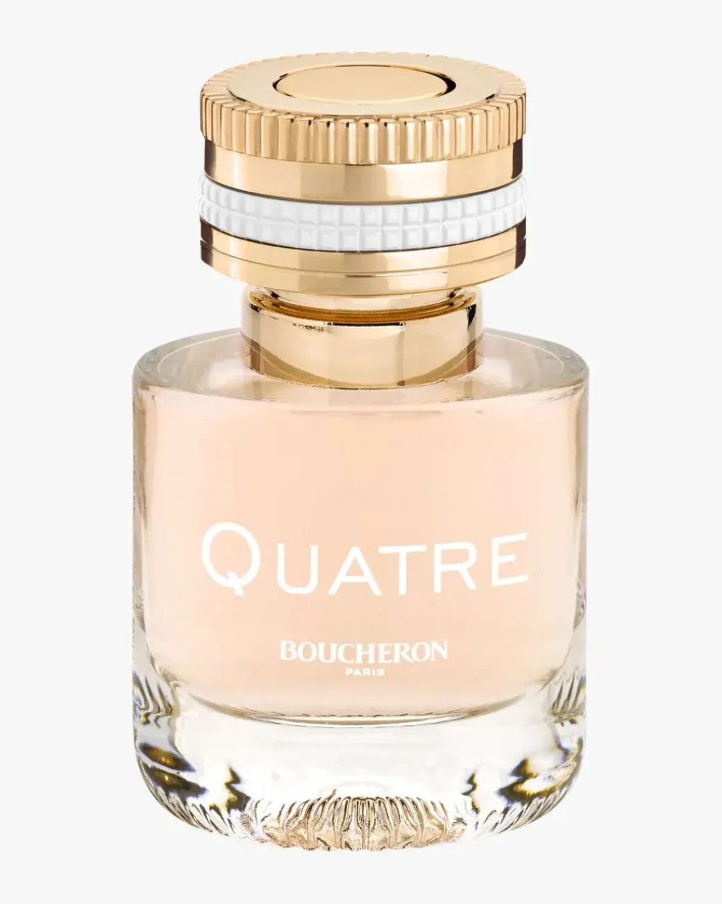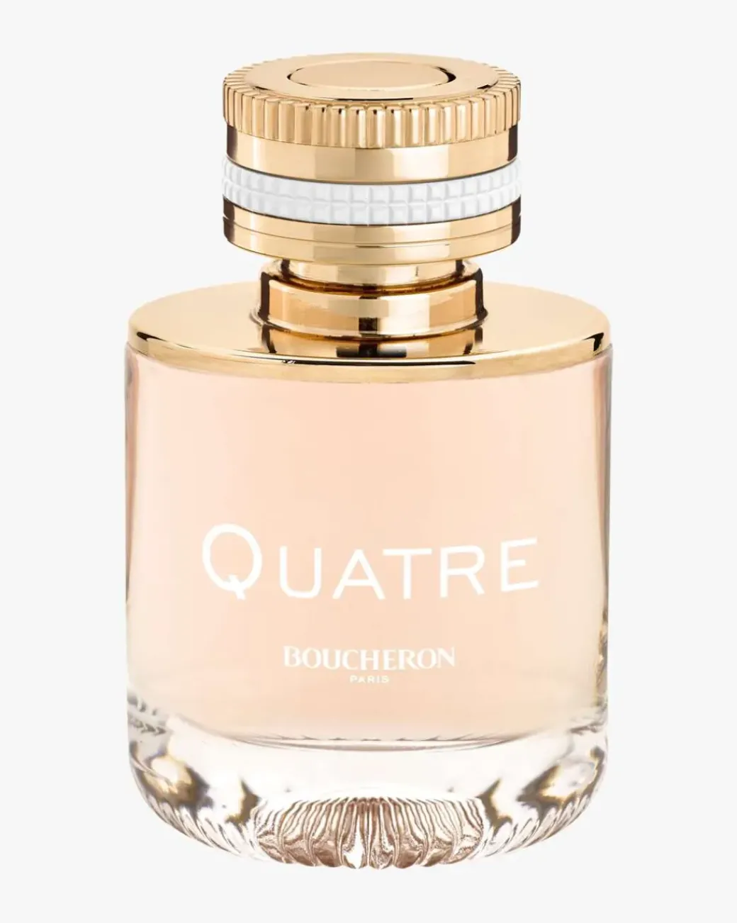 Boucheron Quatre Femme Eau de Parfum åpner friskt med grønn mandarin og bitter appelsin, samtidig som røde bær og villjordbær overrasker oss med deres deilige fruktige noter. Hjertenotene er fylt med sensualitet fra rose og jasmin. Gyldne trenoter og sedertre gir duften en struktur, mens mykheten av cashmere avslører en dyp sensuell duftsti når den blandes med musk. Toppnoter: Bitter appelsin. Hjertenoter: Jasmin. Bunnoter: Sedertre.