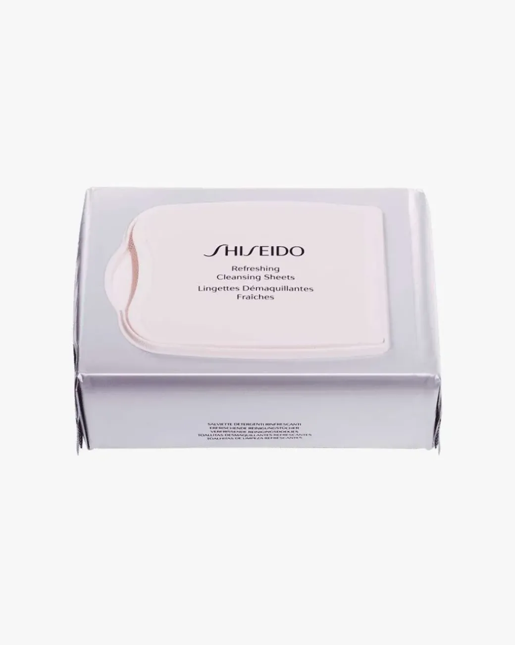Shiseido Refreshing Cleansing Sheets er praktiske, ultra-myke 100% bomulls renseservietter som opprettholder hudens naturlige balanse mens den fjerner urenheter, sminke og overflødig talg som kan tette porene og føre til utbrudd. Raske og enkle å bruke.