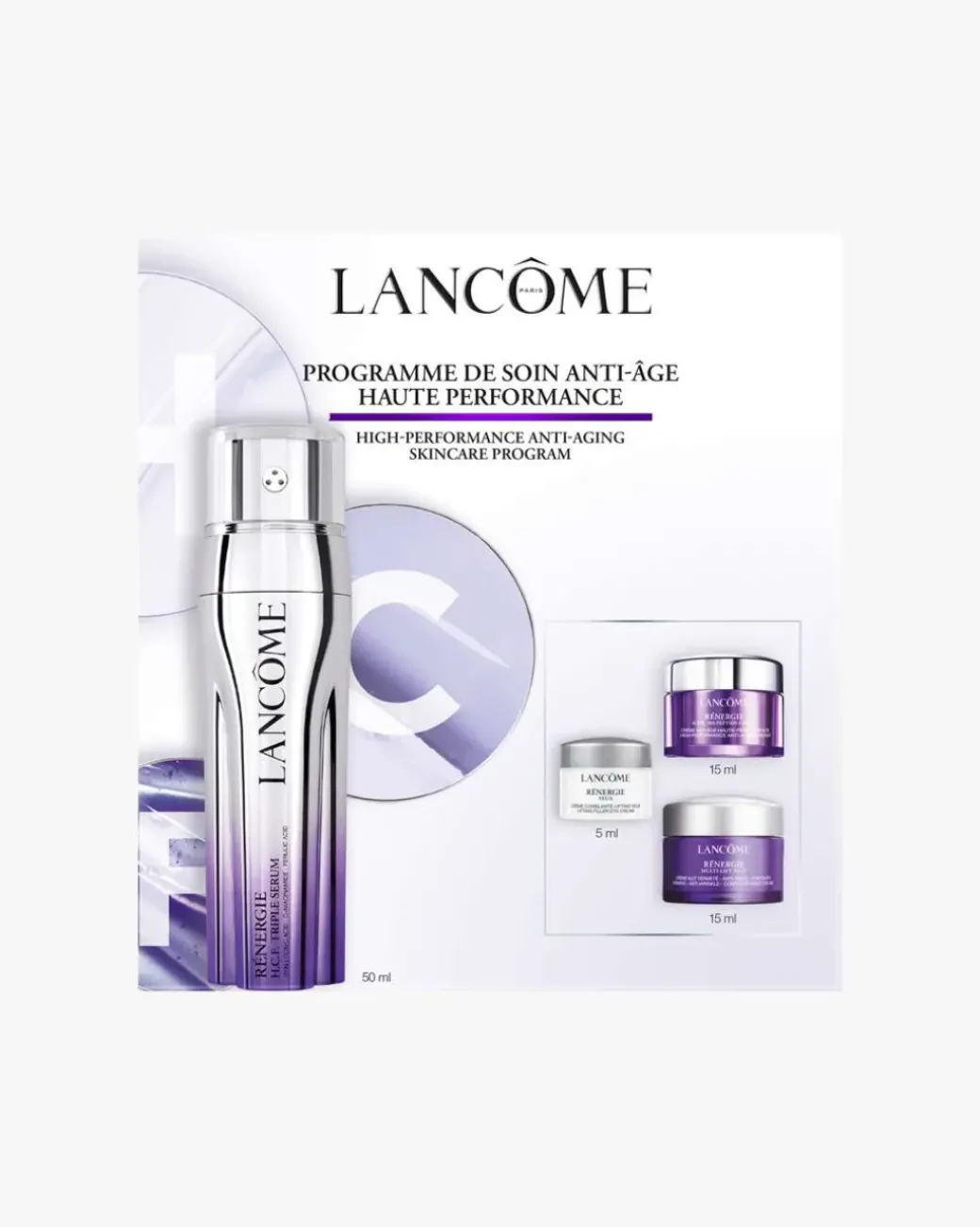 Settet inneholder: Rénergie H.C.F. Triple Serum 50ml, Rénergie H.P.N. 300-Peptide Cream 15ml, Rénergie Multi-Lift Night Cream 15ml og Rénergie Eye Cream 5ml.