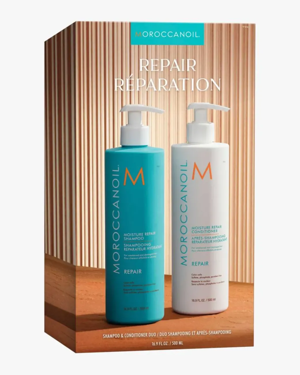 Moroccanoil Repair Duo er et nøye sammensatt sett designet for de med skadet eller kjemisk behandlet hår som søker revitalisering og forsterkning. Inkludert er Repair Shampoo og Conditioner, begge i sjenerøse 500ml flasker, som tilbyr intensiv pleie for å revitalisere og styrke håret over tid.