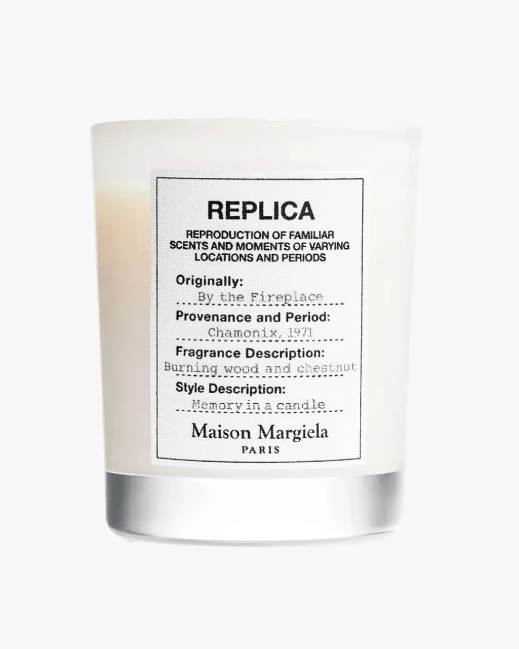 Maison Margiela Replica By The Fireplace Scented Candle. Gi nytt liv til minnene dine og endre atmosfæren i ethvert rom med By the Fireplace duftlys. Vinteren har kommet og snøen faller, men du er trygg inne ved peisen. Du beundrer de grasiøse, dansende flammene innpakket i et teppe med ristede marshmallows og lukter på den varme røksmaken av ved og de varme, diskré hintene av grillede kastanjenøtter.