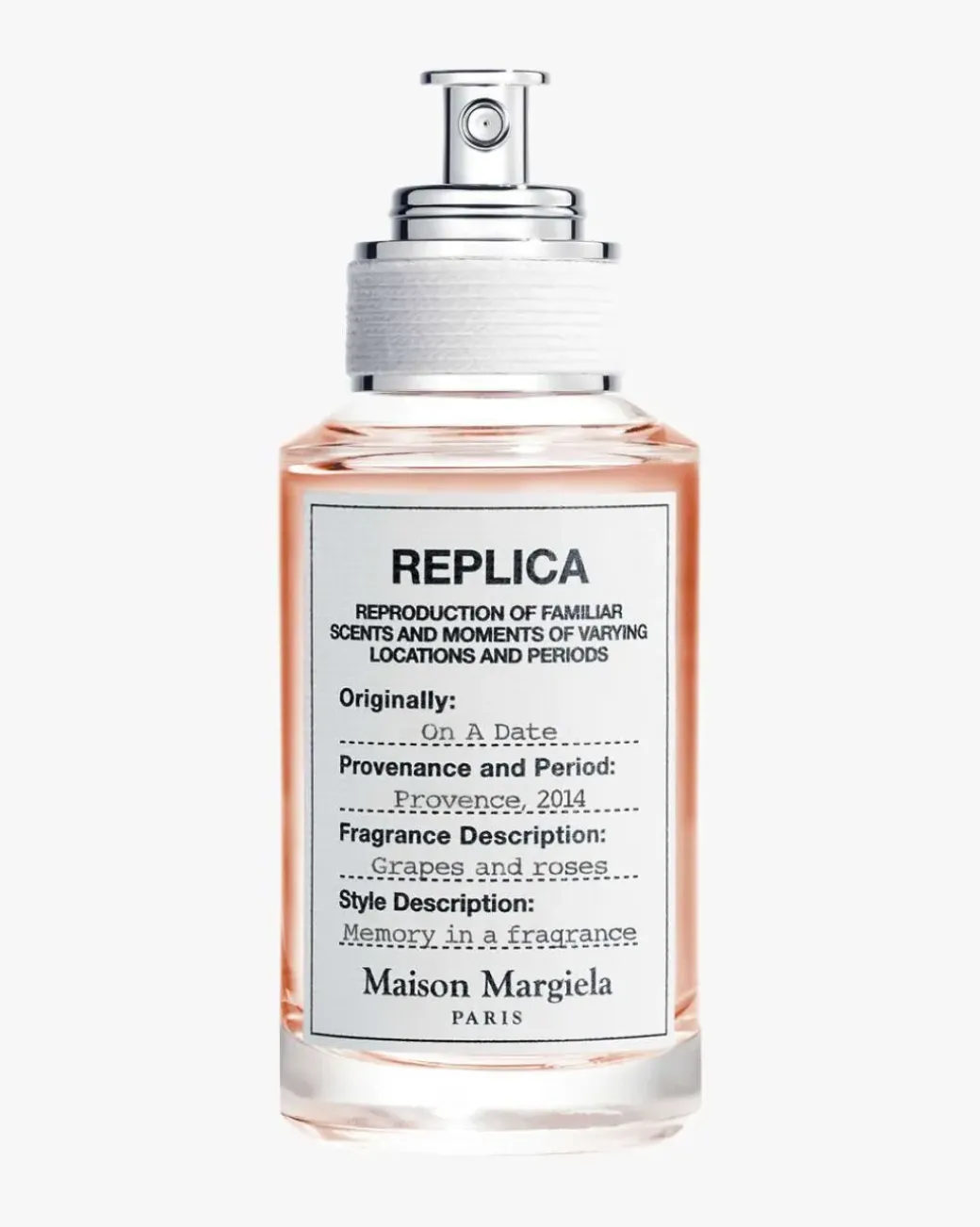 Maison Margiela Replica on a Date Eau de Toilette er en spennende duft inspirert av et magisk stevnemøte en sensommerkveld med utsikt over Provences storslåtte vinmarker ved solnedgang. Den fanger den sprudlende og avhengighetsskapende fruktigheten til modne druer som er dynket av varmt solskinn, og den delikate, men likevel besluttsomme karakteren til villroser.