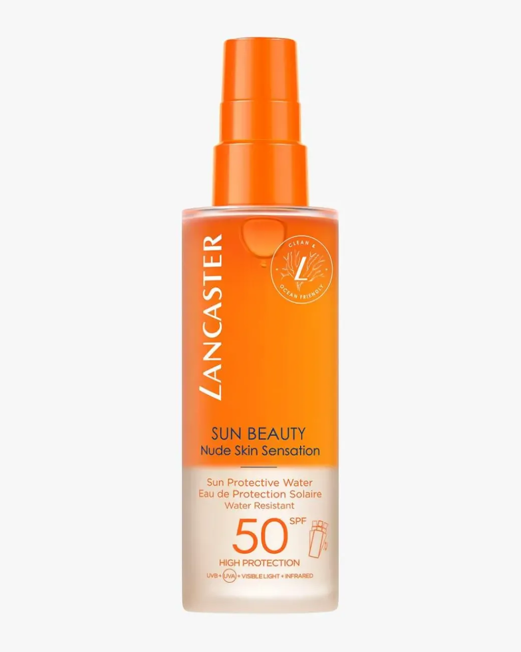 Lancaster Sun Beauty Nude Skin Sensation Sun Protective Water SPF 50 gir deg den bredeste solbeskyttelsen mot UVB-, UVA-, synlig lys- og infrarøde stråler i en utrolig lett og forfriskende “vann”-tekstur. For en gylden, jevn og langvarig brunfarge. Den ikke-fete formelen kan brukes selv på våt hud.