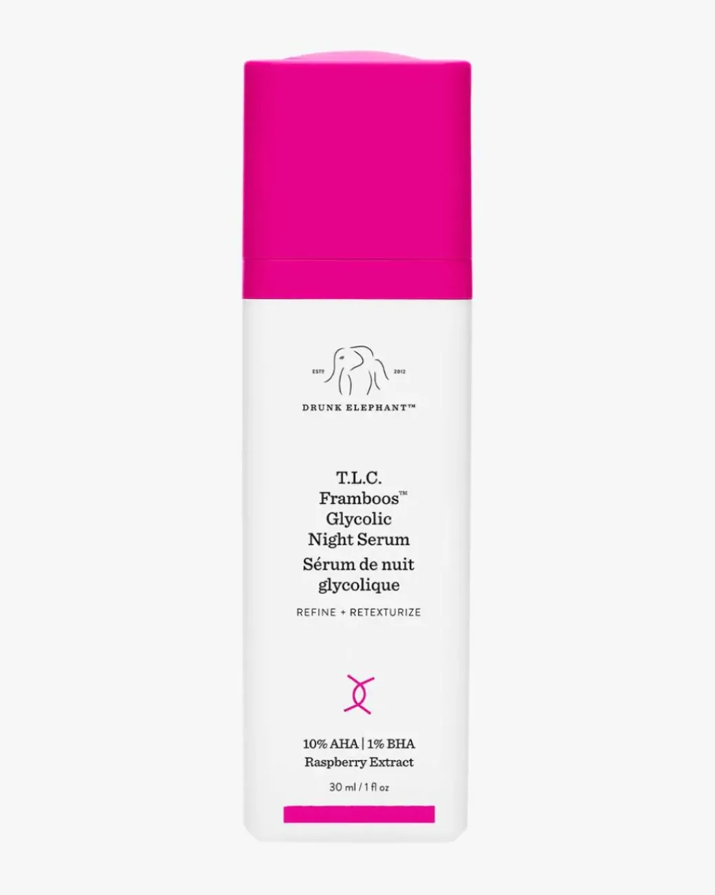 Drunk Elephant T.L.C. Framboos™ Glycolic Night Serum er en høyteknologisk AHA/BHA-gelé som fornyer livløs hud ved forsiktig å fjerne døde hudceller. Dette serumet vil drastisk forbedre hudtonen, teksturen, fine linjer, rynker og porer.