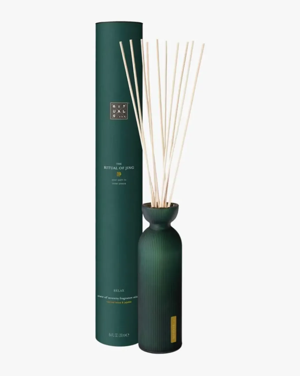 Rituals The Ritual of Jing Fragrance Sticks. Pynt hjemmet ditt på en unik og moteriktig måte med disse duftpinnene basert på den beroligende duften av lotusblomst og jujube. The Ritual of Jing duftpinnergir rommet en lett og beroligende duftopplevelse som passer perfekt med The Ritual of Jing duftlys.