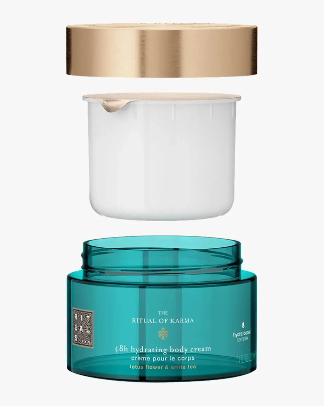 Rituals The Ritual of Karma 48h Hydrating Body Cream Refill er en luksuriøs fuktighetskrem som leverer fuktighet i 48 timer*. Den er beriket med lotusblomst og hvit te som nærer og beroliger huden. En unik teknologi sørger for at kremen er enkel å påføre og absorberes raskt i huden. Når huden din kunne hatt behov for litt ekstra pleie, vil nye Hydra-Boost Complex sørge for at dehydrert hud føles smidig og fornyet etter en dag i solen. Dette unike fuktighetsgivende komplekset av aloe vera, squalane og alger bidrar til å lindre tørr og tørst hud, låser inn fuktighet etter dusjen og gjenoppretter hudens smidighet og elastisitet.