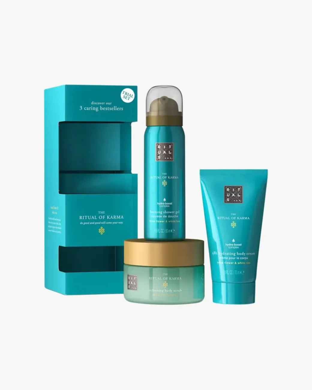 Rituals Trial Set Karma 2024. Settet fra The Ritual of Karma er den perfekte introduksjonen til Rituals og er en ideell gave til noen du er glad i eller til deg selv. Det kombinerer tre av kolleksjonens bestselgere: et dusjskum, en 48-timers fuktighetsgivende kroppskrem av 92% naturlig opprinnelse og en mykgjørende kroppsskrubb av 94% naturlig opprinnelse. Alt beriket med den oppløftende duften av hvit te og lotus.