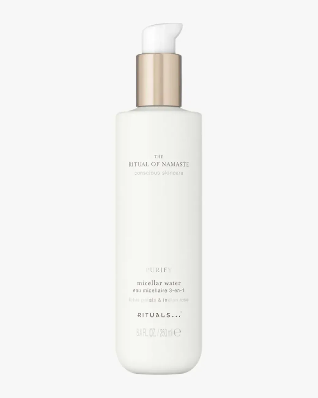 Rituals The Ritual of Namaste Micellar Water. Fremhev din naturlige skjønnhet med tre effekter av ett og samme produkt. Rensevannet både renser, toner og fjerner sminke og urenheter på én gang. Den skånsomme, såpefrie og vannaktige rensen er beriket med ingredienser som lotuskronblader og indisk rose, og trenger ikke å skylles av.
