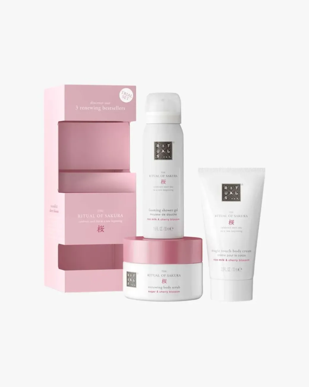 Rituals Trial Set Sakura 2024. Settet fra The Ritual of Sakura er den perfekte introduksjonen til Rituals og er en ideellgave til noen du er glad i eller til deg selv. Det kombinerer tre av kolleksjonens bestselgere: Et dusjskum, en kroppskrem av 92% naturlig opprinnelse og en sukkerskrubb til kroppen av 91% naturlig opprinnelse. Alle er beriket med den fornyende duften av kirsebærblomst og nærende rismelkekstrakt.