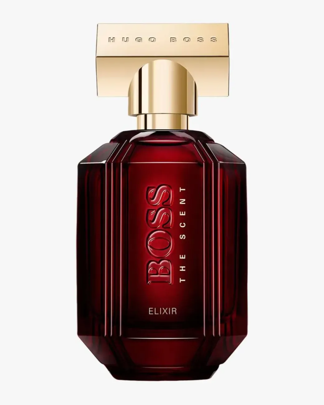 Den ikoniske Boss The Scent-flasken er kledd i det samme dyprøde lakkerte glasset som sitt maskuline motstykke, og reflekterer den forførende intensiteten til den hypnotiske duften inni flasken.