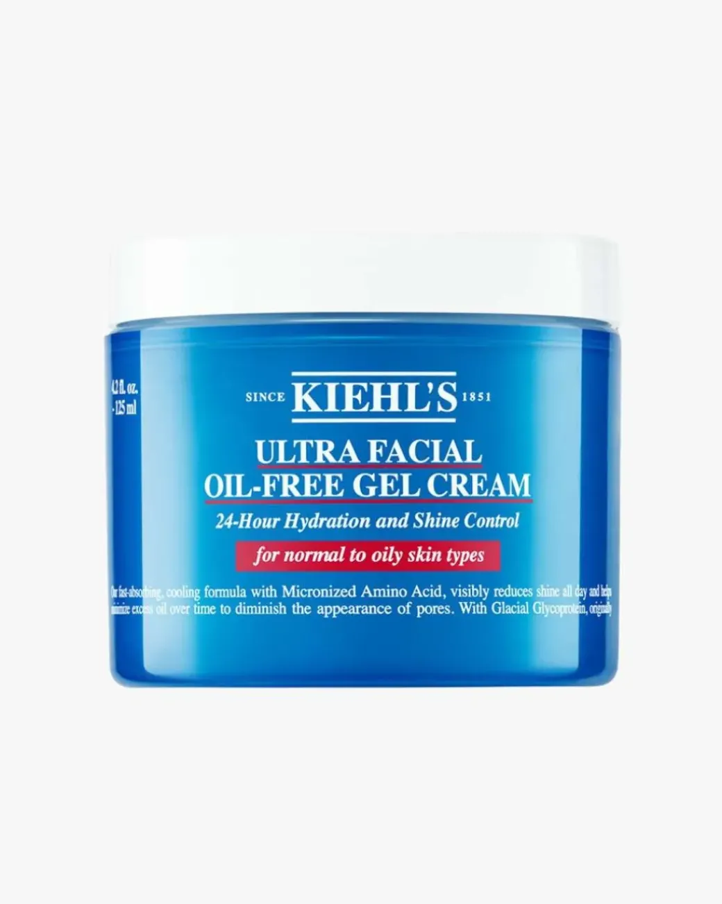 Kiehl’s Ultra Facial Oil-Free Gel Cream er en lett og oppfriskende fuktighetskrem spesielt utviklet til normal eller fet hud. Den gir 24 timers fukt og dens konsistens virker avkjølende og oppfriskende på huden. Den er hurtigabsorberende og trekker umiddelbart inn i huden. Over tid hjelper den til med synlig å redusere porer og fet hud. Huden fremstår oppfrisket og balansert.