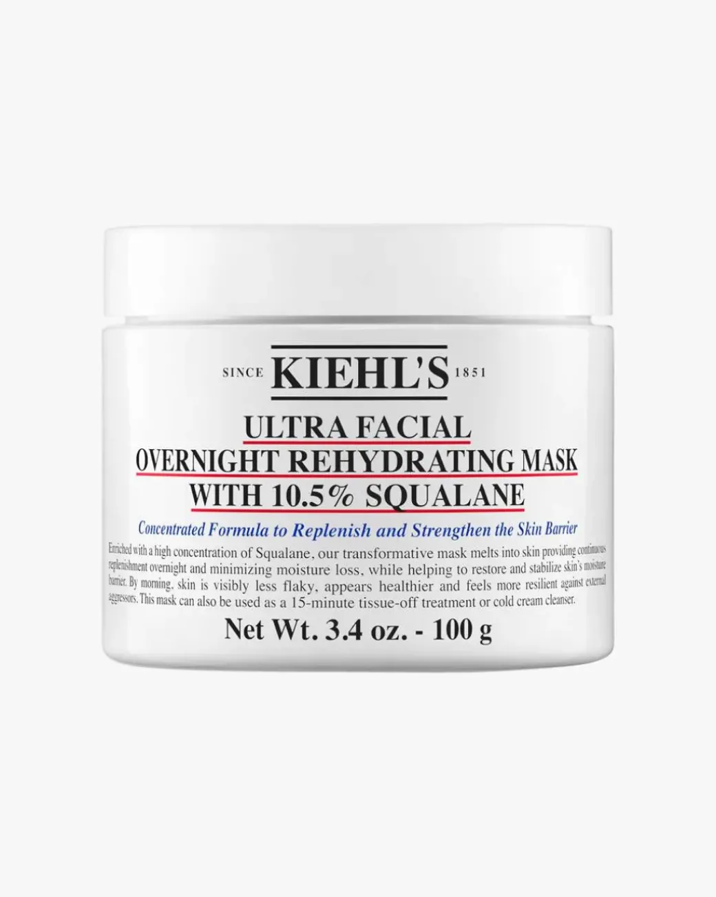 Kiehl’s Ultra Facial Overnight Rehydrating Mask with 10.5% Squalane er en intensivt fuktighetsgivende ansiktsmaske til tørr hud, som bidrar til å stabilisere hudens fuktighetsbarriere og forhindre tap av fuktighet gjennom natten. Ansiktsmasken inneholder 10,5% squalane samt Glacial Glycoprotein, kjent for å nære og styrke huden. Teksturen smelter inn i huden som en ansiktsolje. Våkne opp til hud som ser næret og fyldig ut.