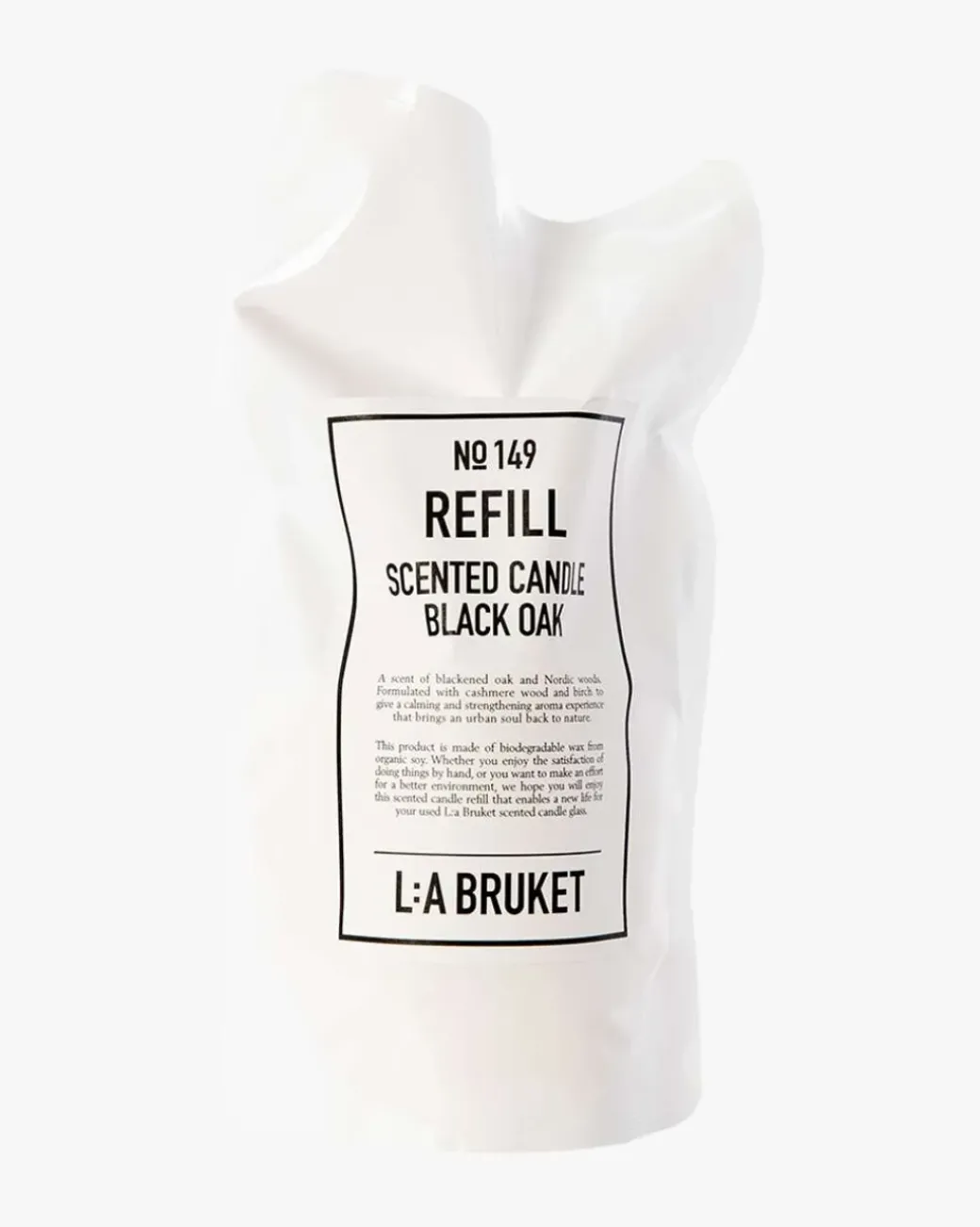 L:A Bruket 149 Scented Candle Black Oak Refill er en duftlysrefill med en duft av svertet eik og nordiske tresorter. Refillen inneholder voks fra økologisk soya, en bomullsveke, vekeanker og en vekeholder i tre. Det ferdiglagde lyset har en brenntid på mer enn 45 timer.