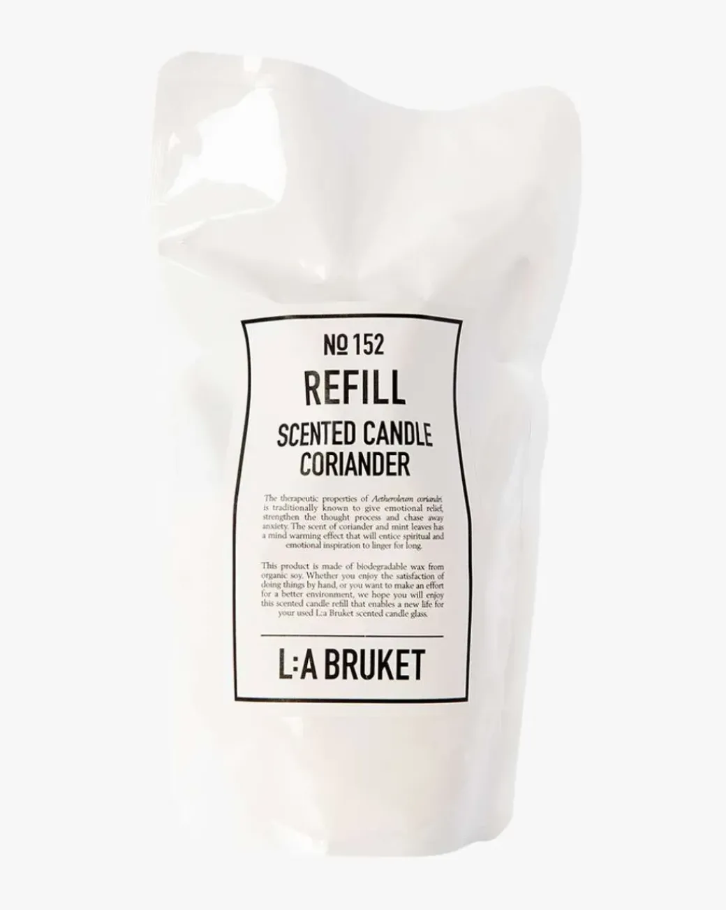 L:A Bruket 152 Scented Candle Coriander Refill er en duftlysrefill med en duft av koriander. Refillen inneholder voks fra økologisk soya, en bomullsveke, vekeanker og en vekeholder i tre. Det ferdiglagde lyset har en brenntid på mer enn 45 timer.
